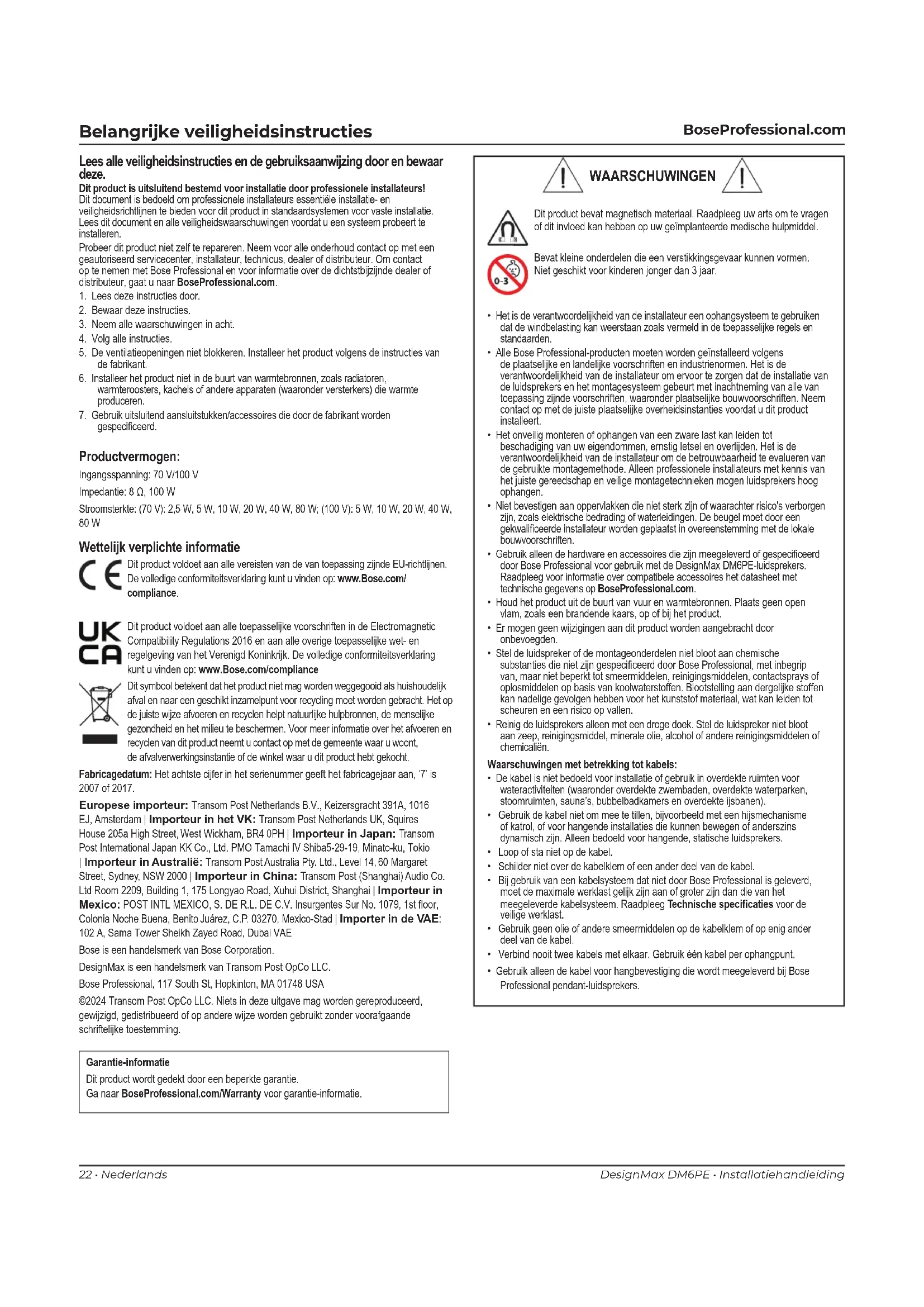 gespeciceerd. Wettelijk verplichte informatie Dit product voldoet aan alle vereisten van de van toepassing zijnde EU-richtlijnen. De volledige conformiteitsverklaring kunt u vinden op: www.Bose.com/ compliance. Dit product voldoet aan alle toepasselijke voorschriften in de Electromagnetic Compatibility Regulations 2016 en aan alle overige toepasselijke wet- en regelgeving van het Verenigd Koninkrijk. De volledige conformiteitsverklaring kunt u vinden op: www.Bose.com/compliance Dit symbool betekent dat het product niet mag worden weggegooid als huishoudelijk afval en naar een geschikt inzamelpunt voor recycling moet worden gebracht. Het op de juiste wijze afvoeren en recyclen helpt natuurlijke hulpbronnen, de menselijke gezondheid en het milieu te beschermen. Voor meer informatie over het afvoeren en recyclen van dit product neemt u contact op met de gemeente waar u woont, de afvalverwerkingsinstantie of de winkel waar u dit product hebt gekocht. Fabricagedatum: Het achtste cijfer in het serienummer geeft het fabricagejaar aan, ‘7’ is 2007 of 2017. Europese importeur: Transom Post Netherlands B.V., Keizersgracht 391A, 1016 EJ, Amsterdam | Importeur in het VK: Transom Post Netherlands UK, Squires House 205a High Street, West Wickham, BR4 0PH | Importeur in Japan: Transom Post International Japan KK Co., Ltd. PMO Tamachi IV Shiba5-29-19, Minato-ku, Tokio | Importeur in Australië: Transom Post Australia Pty. Ltd., Level 14, 60 Margaret Street, Sydney, NSW 2000 | Importeur in China: Transom Post (Shanghai) Audio Co. Ltd Room 2209, Building 1, 175 Longyao Road, Xuhui District, Shanghai | Importeur in Mexico: POST INTL MEXICO, S. DE R.L. DE C.V. Insurgentes Sur No. 1079, 1st oor, Colonia Noche Buena, Benito Juárez, C.P. 03270, Mexico-Stad | Importer in de VAE: 102 A, Sama Tower Sheikh Zayed Road, Dubai VAE Bose is een handelsmerk van Bose Corporation. DesignMax is een handelsmerk van Transom Post OpCo LLC. Bose Professional, 117 South St, Hopkinton, MA 01748 USA ©2024 Transom Post OpCo LLC. Niets in deze uitgave mag worden gereproduceerd, gewijzigd, gedistribueerd of op andere wijze worden gebruikt zonder voorafgaande schriftelijke toestemming. Garantie-informatie Dit product wordt gedekt door een beperkte garantie. Ga naar BoseProfessional.com/Warranty voor garantie-informatie. Productvermogen: Ingangsspanning: 70 V/100 V Impedantie: 8 Ω, 100 W Stroomsterkte: (70 V): 2,5 W, 5 W, 10 W, 20 W, 40 W, 80 W; (100 V): 5 W, 10 W, 20 W, 40 W, 80 W WAARSCHUWINGEN Dit product bevat magnetisch materiaal. Raadpleeg uw arts om te vragen of dit invloed kan hebben op uw geïmplanteerde medische hulpmiddel. Bevat kleine onderdelen die een verstikkingsgevaar kunnen vormen. Niet geschikt voor kinderen jonger dan 3 jaar.