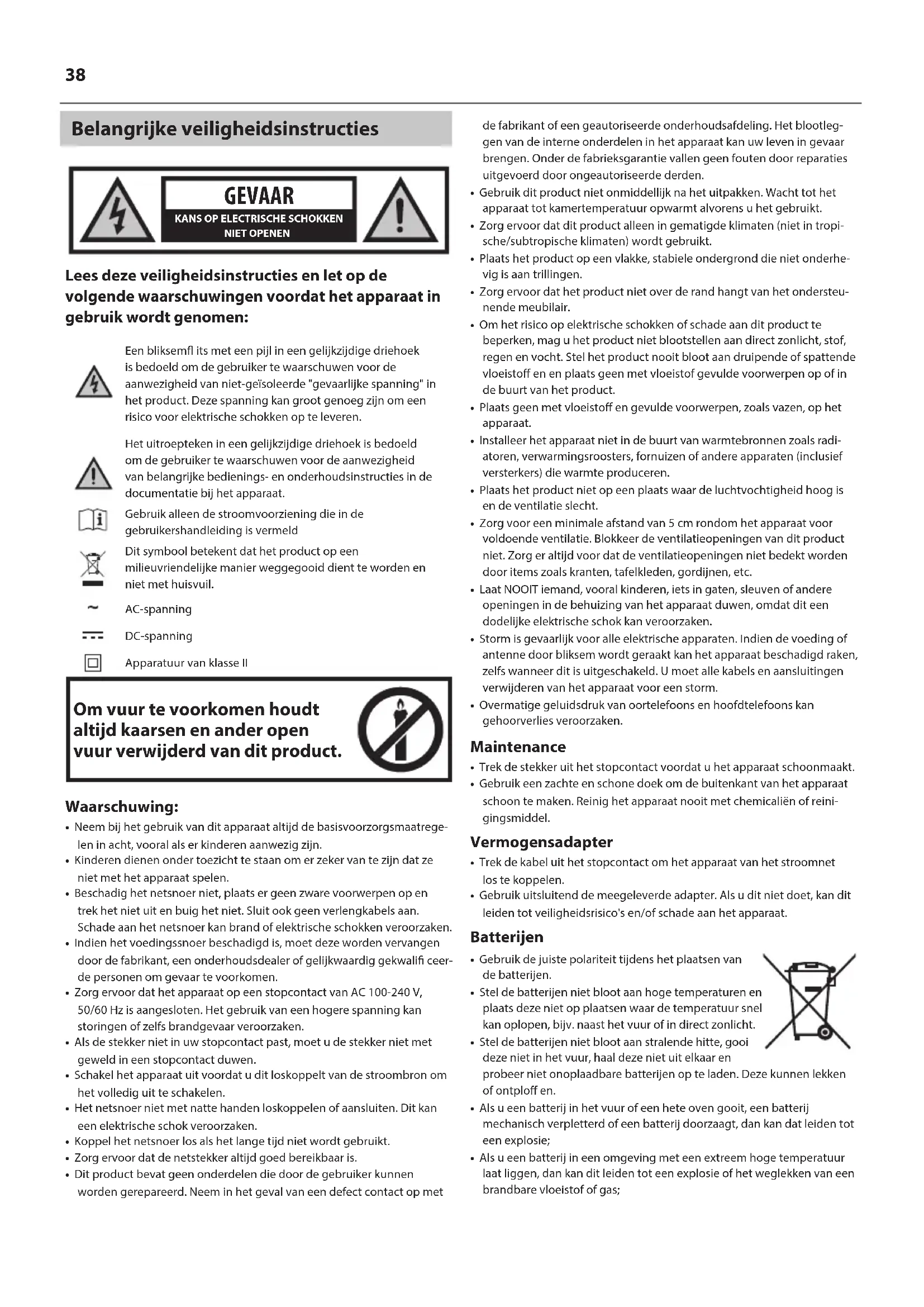 - Neem bij het gebruik van dit apparaat altijd de basisvoorzorgsmaatrege-len in acht, vooral als er kinderen aanwezig zijn.• Kinderen dienen onder toezicht te staan om er zeker van te zijn dat ze niet met het apparaat spelen.• Beschadig het netsnoer niet, plaats er geen zware voorwerpen op en trek het niet uit en buig het niet. Sluit ook geen verlengkabels aan. Schade aan het netsnoer kan brand of elektrische schokken veroorzaken.• Indien het voedingssnoer beschadigd is, moet deze worden vervangen door de fabrikant, een onderhoudsdealer of gelijkwaardig gekwali ceer-de personen om gevaar te voorkomen.• Zorg ervoor dat het apparaat op een stopcontact van AC 100-240 V, 50/60 Hz is aangesloten. Het gebruik van een hogere spanning kan storingen of zelfs brandgevaar veroorzaken.• Als de stekker niet in uw stopcontact past, moet u de stekker niet met geweld in een stopcontact duwen.• Schakel het apparaat uit voordat u dit loskoppelt van de stroombron om het volledig uit te schakelen.• Het netsnoer niet met natte handen loskoppelen of aansluiten. Dit kan een elektrische schok veroorzaken.• Koppel het netsnoer los als het lange tijd niet wordt gebruikt.• Zorg ervoor dat de netstekker altijd goed bereikbaar is.• Dit product bevat geen onderdelen die door de gebruiker kunnen worden gerepareerd. Neem in het geval van een defect contact op met de fabrikant of een geautoriseerde onderhoudsafdeling. Het blootleg-gen van de interne onderdelen in het apparaat kan uw leven in gevaar brengen. Onder de fabrieksgarantie vallen geen fouten door reparaties uitgevoerd door ongeautoriseerde derden.• Gebruik dit product niet onmiddellijk na het uitpakken. Wacht tot het apparaat tot kamertemperatuur opwarmt alvorens u het gebruikt.• Zorg ervoor dat dit product alleen in gematigde klimaten (niet in tropi-sche/subtropische klimaten) wordt gebruikt.• Plaats het product op een vlakke, stabiele ondergrond die niet onderhe-vig is aan trillingen.• Zorg ervoor dat het product niet over de rand hangt van het ondersteu-nende meubilair.• Om het risico op elektrische schokken of schade aan dit product te beperken, mag u het product niet blootstellen aan direct zonlicht, stof, regen en vocht. Stel het product nooit bloot aan druipende of spattende vloeisto en en plaats geen met vloeistof gevulde voorwerpen op of in de buurt van het product.• Plaats geen met vloeisto en gevulde voorwerpen, zoals vazen, op het apparaat.• Installeer het apparaat niet in de buurt van warmtebronnen zoals radi-atoren, verwarmingsroosters, fornuizen of andere apparaten (inclusief versterkers) die warmte produceren.• Plaats het product niet op een plaats waar de luchtvochtigheid hoog is en de ventilatie slecht.• Zorg voor een minimale afstand van 5 cm rondom het apparaat voor voldoende ventilatie. Blokkeer de ventilatieopeningen van dit product niet. Zorg er altijd voor dat de ventilatieopeningen niet bedekt worden door items zoals kranten, tafelkleden, gordijnen, etc.• Laat NOOIT iemand, vooral kinderen, iets in gaten, sleuven of andere openingen in de behuizing van het apparaat duwen, omdat dit een dodelijke elektrische schok kan veroorzaken.• Storm is gevaarlijk voor alle elektrische apparaten. Indien de voeding of antenne door bliksem wordt geraakt kan het apparaat beschadigd raken, zelfs wanneer dit is uitgeschakeld. U moet alle kabels en aansluitingen verwijderen van het apparaat voor een storm.• Overmatige geluidsdruk van oortelefoons en hoofdtelefoons kan gehoorverlies veroorzaken. Maintenance