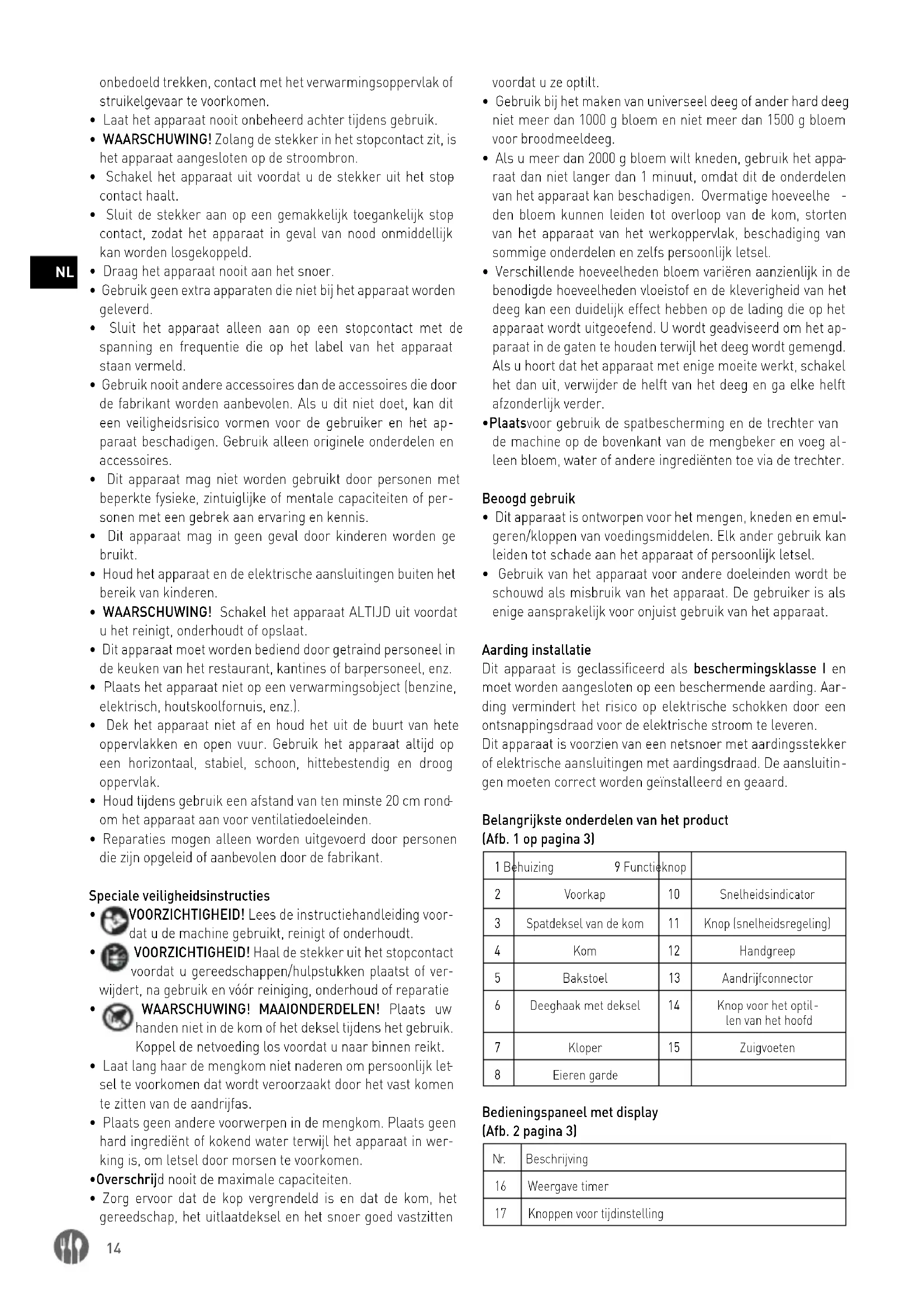 gen moeten correct worden geïnstalleerd en geaard. Belangrijkste onderdelen van het product (Afb. 1 op pagina 3) 1 Behuizing 9 Functieknop 2 Voorkap 10 Snelheidsindicator 3 Spatdeksel van de kom 11 Knop (snelheidsregeling) 4 Kom 12 Handgreep 5 Bakstoel 13 Aandrijfconnector 6 Deeghaak met deksel 14 Knop voor het optil