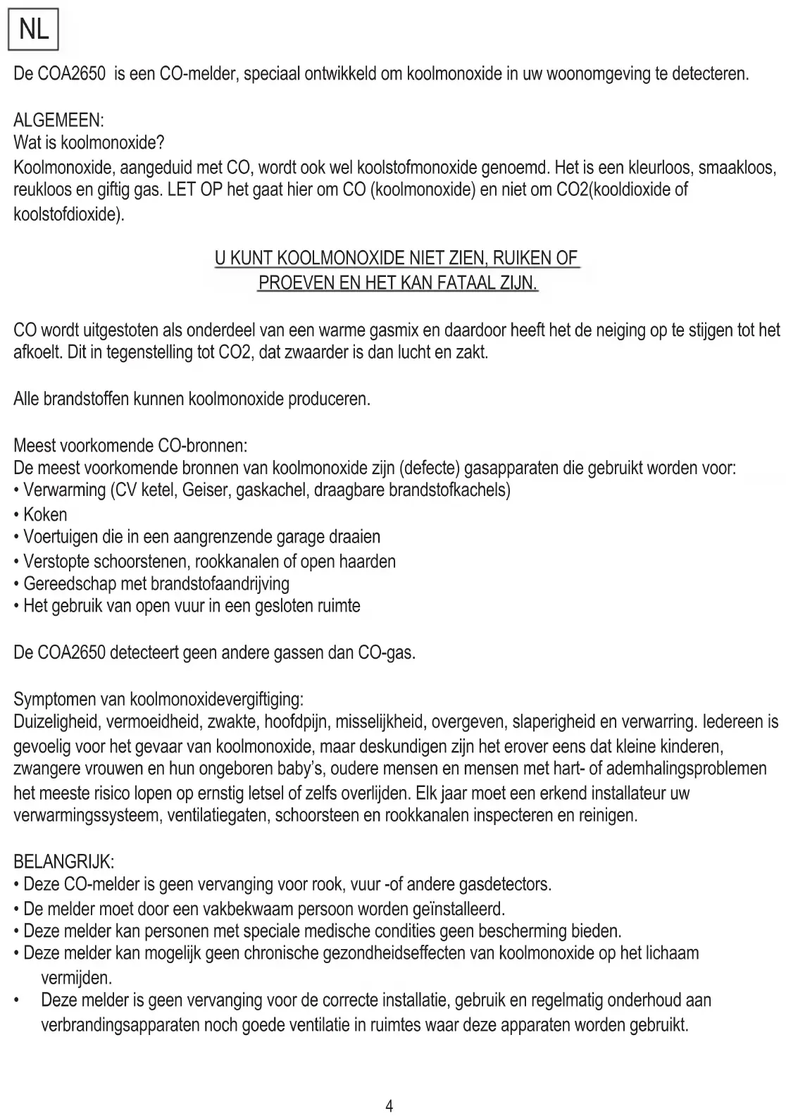 De COA2650 is een CO-melder, speciaal ontwikkeld om koolmonoxide in uw woonomgeving te detecteren. ALGEMEEN: Wat is koolmonoxide? Koolmonoxide, aangeduid met CO, wordt ook wel koolstofmonoxide genoemd. Het is een kleurloos, smaakloos, reukloos en giftig gas. LET OP het gaat hier om CO (koolmonoxide) en niet om CO2(kooldioxide of koolstofdioxide). U KUNT KOOLMONOXIDE NIET ZIEN, RUIKEN OF PROEVEN EN HET KAN FATAAL ZIJN. CO wordt uitgestoten als onderdeel van een warme gasmix en daardoor heeft het de neiging op te stijgen tot het afkoelt. Dit in tegenstelling tot CO2, dat zwaarder is dan lucht en zakt. Alle brandstoffen kunnen koolmonoxide produceren. Meest voorkomende CO-bronnen: De meest voorkomende bronnen van koolmonoxide zijn (defecte) gasapparaten die gebruikt worden voor: