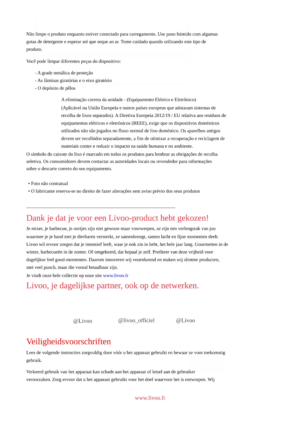 Dank je dat je voor een Livoo-product hebt gekozen! Je mixer, je barbecue, je oortjes zijn niet gewoon maar voorwerpen, ze zijn een verlengstuk van jou waarmee je je band met je dierbaren versterkt, ze samenbrengt, samen lacht en fijne momenten deelt. Livoo wil ervoor zorgen dat je intensief leeft, waar je ook zin in hebt, het hele jaar lang. Gourmetten in de winter, barbecueën in de zomer. Of omgekeerd, dat bepaal je zelf. Profiteer van deze vrijheid voor dagelijkse feel good-momenten. Daarom innoveren wij voortdurend en maken wij slimme producten, met veel punch, maar die vooral betaalbaar zijn. Je vindt onze hele collectie op onze site www.livoo.fr Livoo, je dagelijkse partner, ook op de netwerken.
