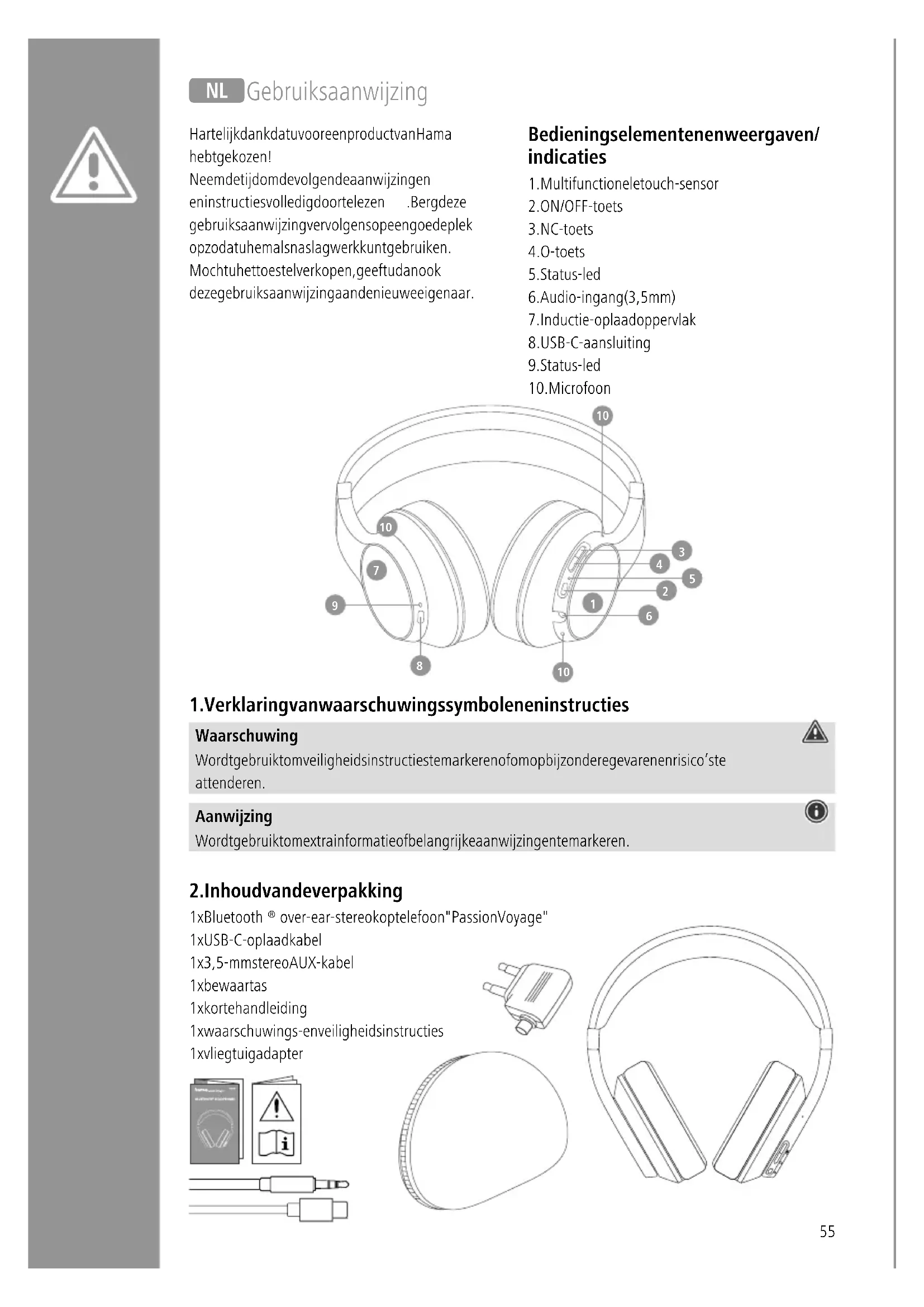 over-ear-stereo koptelefoon "Passion Voyage" 1x USB-C-oplaadkabel 1x 3,5-mm stereo AUX-kabel 1x bewaartas 1x korte handleiding 1x waarschuwings- en veiligheidsinstructies 1x vliegtuigadapter N Gebruiksaanwijzing Hartelijk dank dat u voor een product van Hama hebt gekozen! Neem de tijd om de volgende aanwijzingen en instructies volledig door te lezen Berg deze gebruiksaanwijzing vervolgens op een goede plek op zodat u hem als naslagwerk kunt gebruiken Mocht u het toestel verkopen, geeft u dan ook deze gebruiksaanwijzing aan de nieuwe eigenaar Bedieningselementen en weergaven/ indicaties 1 Multifunctionele touch-sensor 2 ON/OFF-toets 3 NC-toets