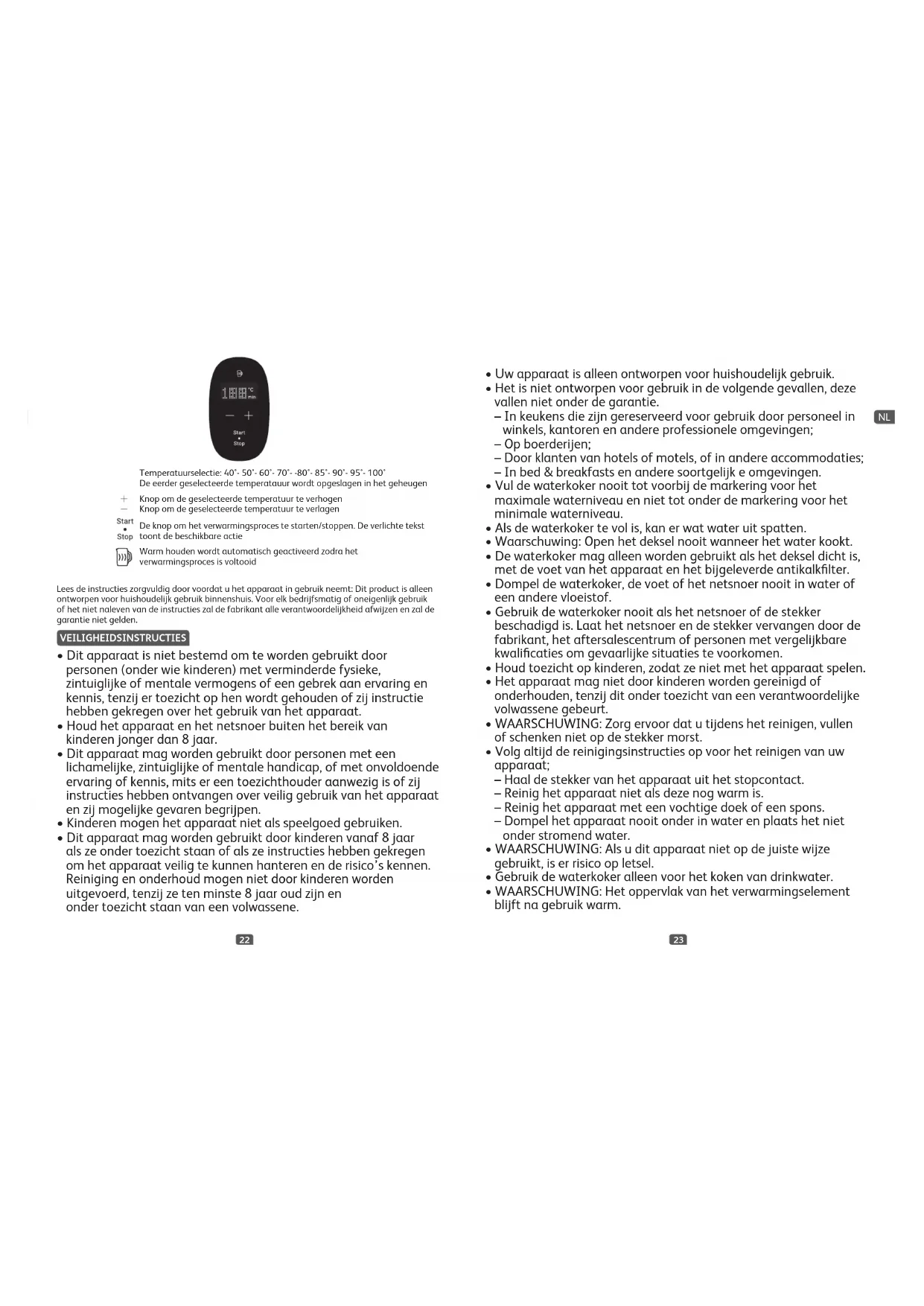 Wanneer de waterkoker op de voet wordt geplaatst, branden alle lampjes gedurende 1 seconde. Vervolgens wordt de watertemperatuur in de waterkoker op het scherm weergegeven en gaan de knoppen , en branden. WATER OPWARMEN: (Afb. 4) Selecteer de temperatuur door op en te drukken. 9 mogelijke instellingen: 40°- 50°- 60°- 70°- -80°- 85°- 90°- 95°- 100° - Druk op de verlichte startknop of wacht tot de lampjes vijf keer knipperen. De waterkoker begint met opwarmen. Zodra het verwarmingsproces begint, gaat de startknop uit en gaat de stopknop branden. Telkens wanneer het verwarmingsproces begint, wordt de geselecteerde temperatuur in het geheugen opgeslagen. Wanneer u de waterkoker de volgende keer op de voet plaatst, kunt u deze verwarmen met de laatst gekozen temperatuur door op te drukken. U kunt de huidige temperatuur van het water op het scherm controleren. Zodra de gekozen temperatuur is bereikt, piept de waterkoker tweemaal en schakelt deze automatisch over naar de warmhoudmodus gedurende 30 minuten. Als u de verwarmingsprogramma’s wilt uitschakelen, drukt u op de verlichte stopknop. LET OP Na 90 °C kookt de waterkoker het water, stopt hij met koken en begint hij opnieuw met koken. Dit proces wordt meerdere malen uitgevoerd en gaat door tot het einde van het verwarmingsproces. Dit is normaal. WARMHOUDMODUS De waterkoker schakelt automatisch over naar de warmhoudmodus nadat de gekozen temperatuur is bereikt. U hoeft hiervoor niets te doen. De warmhoudmodus duurt 30 minuten voor de geselecteerde temperatuur. De afteltijd en de geselecteerde temperatuur worden afwisselend op het scherm weergegeven. Zodra de warmhoudmodus de cyclus heeft bereikt, piept de waterkoker tweemaal. NL2726 Als u 100 °C kiest, houdt de warmhoudfunctie de temperatuur 30 minuten op 95 °C. Als de waterkoker wordt weggehaald en vervolgens weer op de voet wordt geplaatst, kunt u de warmhoudmodus voortzetten door op de knop te drukken. Als u het warmhoudprogramma binnen 30 minuten wilt uitschakelen, drukt u op de verlichte stopknop. LET OP Het scherm wordt na 30 seconden automatisch uitgeschakeld zonder de knoppen aan te raken. Als u op de witte stip tussen de knoppen Start en Stop drukt, wordt het scherm weer ingeschakeld. U kunt ook twee seconden op de knop met de witte stip drukken om het lopende proces te stoppen en het scherm onmiddellijk uit te schakelen. Als de temperatuur van het water in de waterkoker hoger is dan de temperatuur die u selecteert wanneer u op drukt, wordt het water niet verwarmd. Als de watertemperatuur bijvoorbeeld 90 °C is, kunt u de verwarming niet starten door 40 °C, 70 °C of 80 °C te selecteren. AANBEVOLEN TEMPERATUREN 40 °C: babymelk 70 °C: witte thee 80 °C: groene thee 90 °C: versgemalen koffie 100 °C: kokend water/infusies