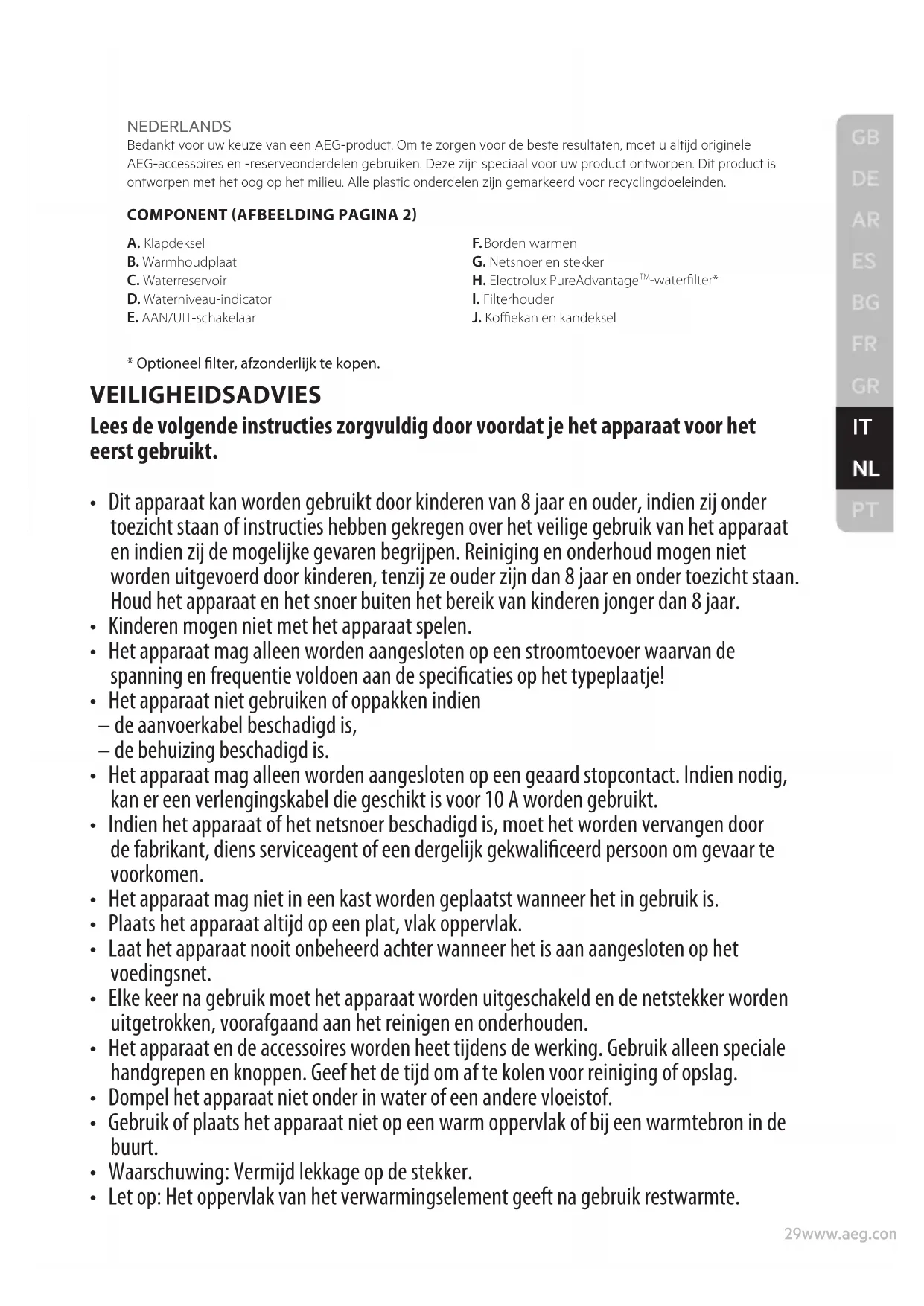 NEDERLANDS Bedankt voor uw keuze van een AEG-product. Om te zorgen voor de beste resultaten, moet u altijd originele AEG-accessoires en -reserveonderdelen gebruiken. Deze zijn speciaal voor uw product ontworpen. Dit product is ontworpen met het oog op het milieu. Alle plastic onderdelen zijn gemarkeerd voor recyclingdoeleinden. COMPONENT (AFBEELDING PAGINA 2) A. Klapdeksel B. Warmhoudplaat C. Waterreservoir D. Waterniveau-indicator E. AAN/UIT-schakelaar F. Borden warmen G. Netsnoer en stekker H. Electrolux PureAdvantage