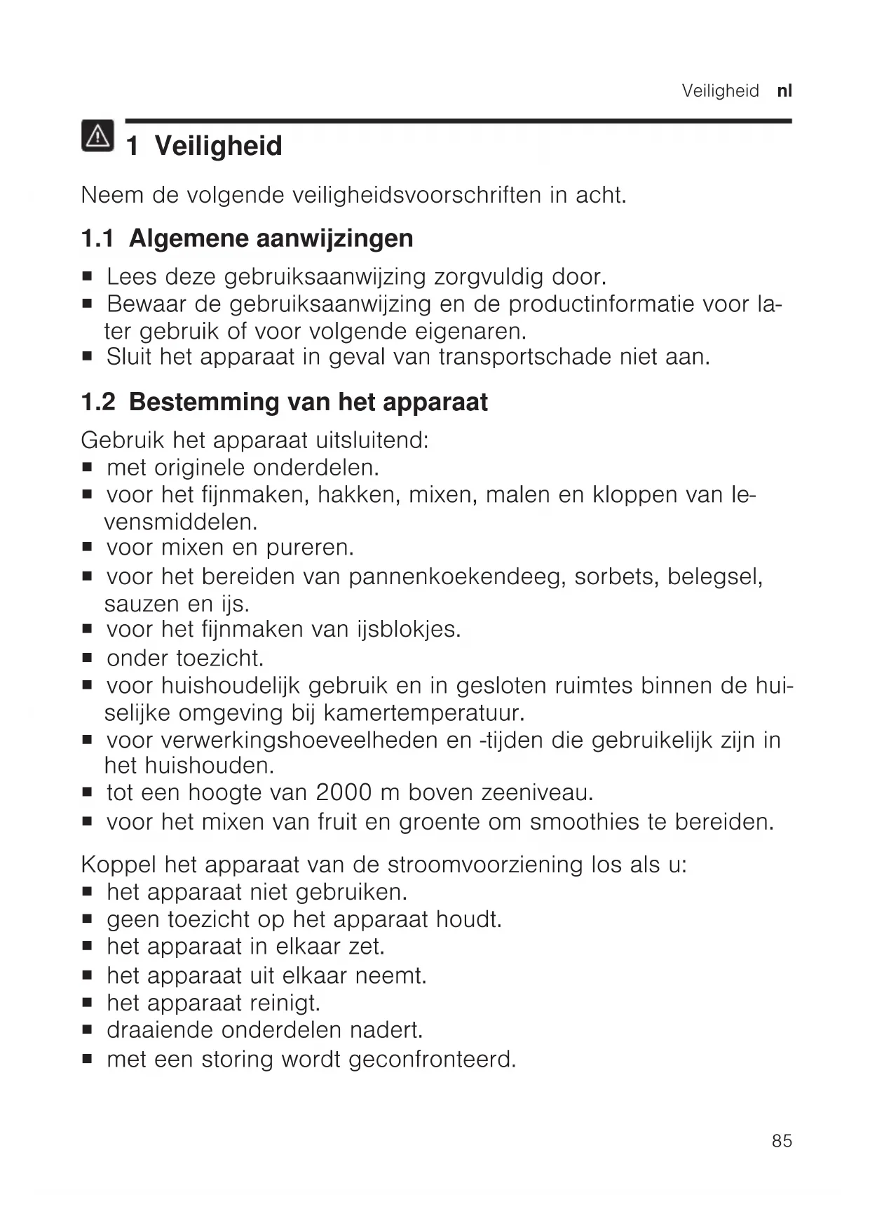 1 Veiligheid Neem de volgende veiligheidsvoorschriften in acht. 1.1 Algemene aanwijzingen ¡ Lees deze gebruiksaanwijzing zorgvuldig door. ¡ Bewaar de gebruiksaanwijzing en de productinformatie voor la- ter gebruik of voor volgende eigenaren. ¡ Sluit het apparaat in geval van transportschade niet aan. 1.2 Bestemming van het apparaat Gebruik het apparaat uitsluitend: ¡ met originele onderdelen. ¡ voor het fijnmaken, hakken, mixen, malen en kloppen van le- vensmiddelen. ¡ voor mixen en pureren. ¡ voor het bereiden van pannenkoekendeeg, sorbets, belegsel, sauzen en ijs. ¡ voor het fijnmaken van ijsblokjes. ¡ onder toezicht. ¡ voor huishoudelijk gebruik en in gesloten ruimtes binnen de hui- selijke omgeving bij kamertemperatuur. ¡ voor verwerkingshoeveelheden en -tijden die gebruikelijk zijn in het huishouden. ¡ tot een hoogte van 2000m boven zeeniveau. ¡ voor het mixen van fruit en groente om smoothies te bereiden. Koppel het apparaat van de stroomvoorziening los als u: ¡ het apparaat niet gebruiken. ¡ geen toezicht op het apparaat houdt. ¡ het apparaat in elkaar zet. ¡ het apparaat uit elkaar neemt. ¡ het apparaat reinigt. ¡ draaiende onderdelen nadert. ¡ met een storing wordt geconfronteerd.nl Veiligheid