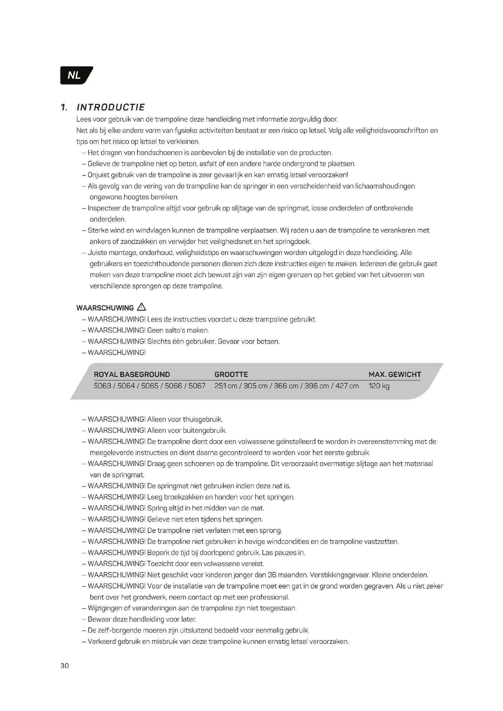 – WAARSCHUWING! Alleen voor thuisgebruik. – WAARSCHUWING! Alleen voor buitengebruik. – WAARSCHUWING! De trampoline dient door een volwassene geïnstalleerd te worden in overeenstemming met de meegeleverde instructies en dient daarna gecontroleerd te worden voor het eerste gebruik. – WAARSCHUWING! Draag geen schoenen op de trampoline. Dit veroorzaakt overmatige slijtage aan het materiaal van de springmat. – WAARSCHUWING! De springmat niet gebruiken indien deze nat is. – WAARSCHUWING! Leeg broekzakken en handen voor het springen. – WAARSCHUWING! Spring altijd in het midden van de mat. – WAARSCHUWING! Gelieve niet eten tijdens het springen. – WAARSCHUWING! De trampoline niet verlaten met een sprong. – WAARSCHUWING! De trampoline niet gebruiken in hevige windcondities en de trampoline vastzetten. – WAARSCHUWING! Beperk de tijd bij doorlopend gebruik. Las pauzes in. – WAARSCHUWING! Toezicht door een volwassene vereist. – WAARSCHUWING! Niet geschikt voor kinderen jonger dan 36 maanden. Verstikkingsgevaar. Kleine onderdelen. – WAARSCHUWING! Voor de installatie van de trampoline moet een gat in de grond worden gegraven. Als u niet zeker bent over het grondwerk, neem contact op met een professional. – Wijzigingen of veranderingen aan de trampoline zijn niet toegestaan. – Bewaar deze handleiding voor later. – De zelf-borgende moeren zijn uitsluitend bedoeld voor eenmalig gebruik. – Verkeerd gebruik en misbruik van deze trampoline kunnen ernstig letsel veroorzaken. ROYAL BASEGROUND 5063 / 5064 / 5065 / 5066 / 5067 GROOTTE 251 cm / 305 cm / 366 cm / 396 cm / 427 cm MAX. GEWICHT 120 kg
