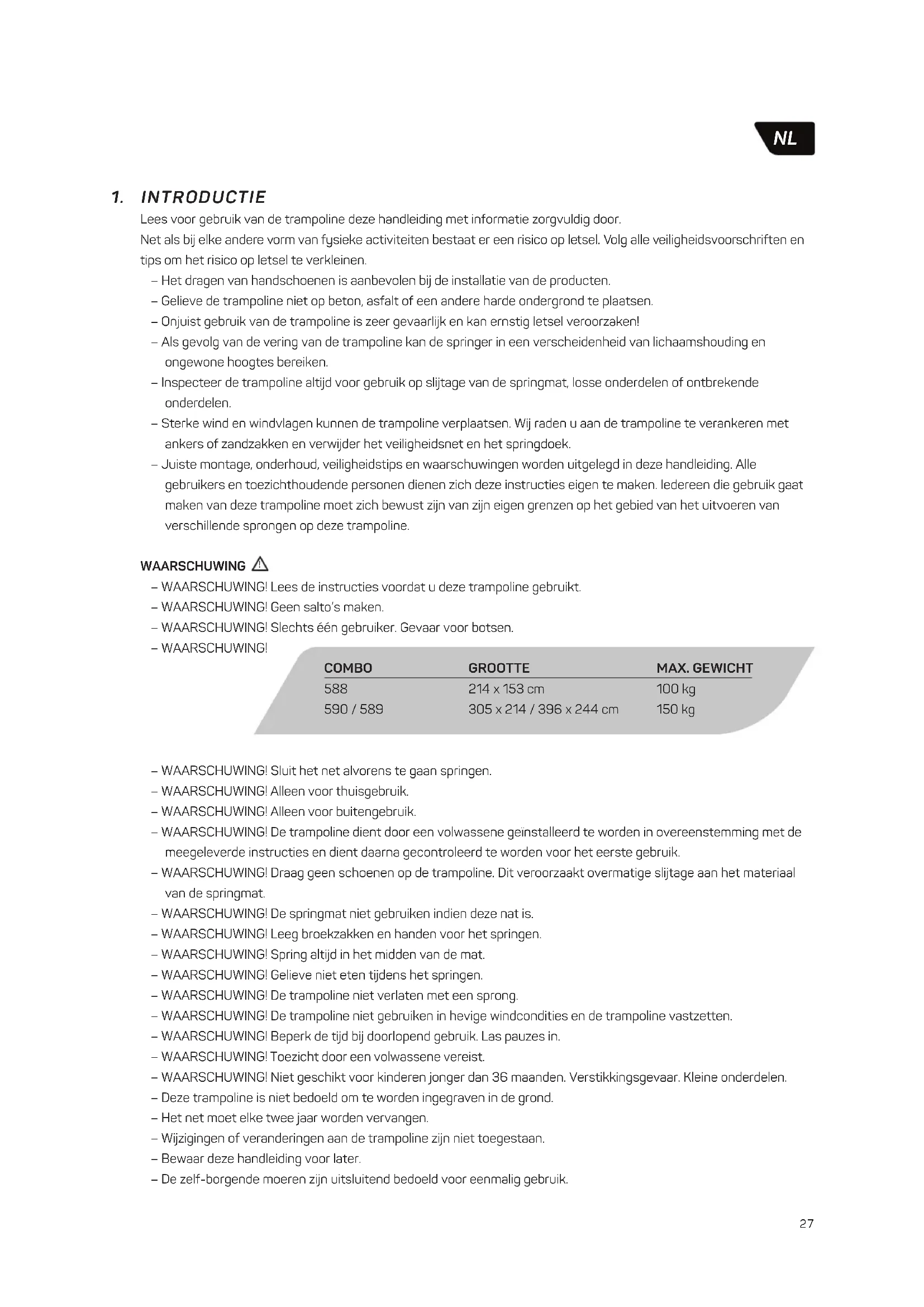 – WAARSCHUWING! Sluit het net alvorens te gaan springen. – WAARSCHUWING! Alleen voor thuisgebruik. – WAARSCHUWING! Alleen voor buitengebruik. – WAARSCHUWING! De trampoline dient door een volwassene geïnstalleerd te worden in overeenstemming met de meegeleverde instructies en dient daarna gecontroleerd te worden voor het eerste gebruik. – WAARSCHUWING! Draag geen schoenen op de trampoline. Dit veroorzaakt overmatige slijtage aan het materiaal van de springmat. – WAARSCHUWING! De springmat niet gebruiken indien deze nat is. – WAARSCHUWING! Leeg broekzakken en handen voor het springen. – WAARSCHUWING! Spring altijd in het midden van de mat. – WAARSCHUWING! Gelieve niet eten tijdens het springen. – WAARSCHUWING! De trampoline niet verlaten met een sprong. – WAARSCHUWING! De trampoline niet gebruiken in hevige windcondities en de trampoline vastzetten. – WAARSCHUWING! Beperk de tijd bij doorlopend gebruik. Las pauzes in. – WAARSCHUWING! Toezicht door een volwassene vereist. – WAARSCHUWING! Niet geschikt voor kinderen jonger dan 36 maanden. Verstikkingsgevaar. Kleine onderdelen. – Deze trampoline is niet bedoeld om te worden ingegraven in de grond. – Het net moet elke twee jaar worden vervangen. – Wijzigingen of veranderingen aan de trampoline zijn niet toegestaan. – Bewaar deze handleiding voor later. – De zelf-borgende moeren zijn uitsluitend bedoeld voor eenmalig gebruik. COMBO