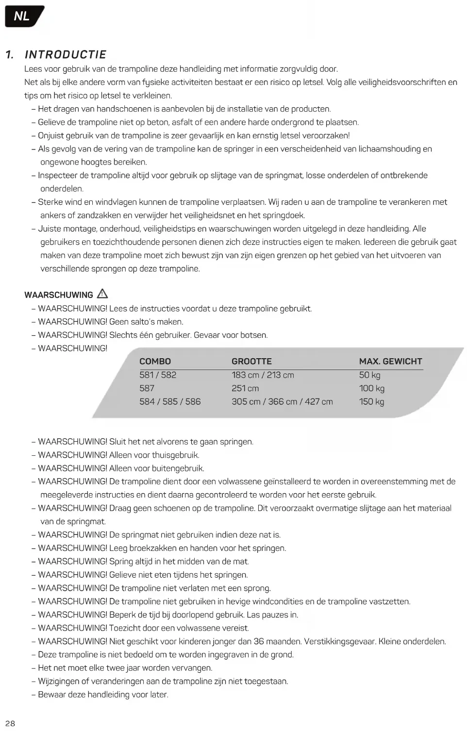 Lees voor gebruik van de trampoline deze handleiding met informatie zorgvuldig door. Net als bij elke andere vorm van fysieke activiteiten bestaat er een risico op letsel. Volg alle veiligheidsvoorschriften en tips om het risico op letsel te verkleinen. – Het dragen van handschoenen is aanbevolen bij de installatie van de producten. – Gelieve de trampoline niet op beton, asfalt of een andere harde ondergrond te plaatsen. – Onjuist gebruik van de trampoline is zeer gevaarlijk en kan ernstig letsel veroorzaken! – Als gevolg van de vering van de trampoline kan de springer in een verscheidenheid van lichaamshouding en ongewone hoogtes bereiken. – Inspecteer de trampoline altijd voor gebruik op slijtage van de springmat, losse onderdelen of ontbrekende onderdelen. – Sterke wind en windvlagen kunnen de trampoline verplaatsen. Wij raden u aan de trampoline te verankeren met ankers of zandzakken en verwijder het veiligheidsnet en het springdoek. – Juiste montage, onderhoud, veiligheidstips en waarschuwingen worden uitgelegd in deze handleiding. Alle gebruikers en toezichthoudende personen dienen zich deze instructies eigen te maken. Iedereen die gebruik gaat maken van deze trampoline moet zich bewust zijn van zijn eigen grenzen op het gebied van het uitvoeren van verschillende sprongen op deze trampoline. WAARSCHUWING – WAARSCHUWING! Lees de instructies voordat u deze trampoline gebruikt. – WAARSCHUWING! Geen salto’s maken. – WAARSCHUWING! Slechts één gebruiker. Gevaar voor botsen. – WAARSCHUWING!