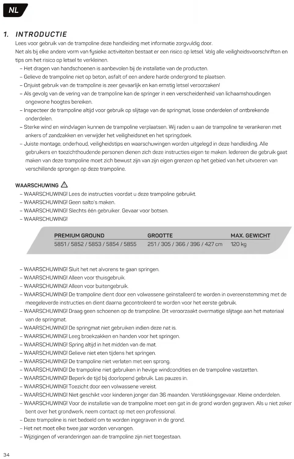 – WAARSCHUWING! Sluit het net alvorens te gaan springen. – WAARSCHUWING! Alleen voor thuisgebruik. – WAARSCHUWING! Alleen voor buitengebruik. – WAARSCHUWING! De trampoline dient door een volwassene geïnstalleerd te worden in overeenstemming met de meegeleverde instructies en dient daarna gecontroleerd te worden voor het eerste gebruik. – WAARSCHUWING! Draag geen schoenen op de trampoline. Dit veroorzaakt overmatige slijtage aan het materiaal van de springmat. – WAARSCHUWING! De springmat niet gebruiken indien deze nat is. – WAARSCHUWING! Leeg broekzakken en handen voor het springen. – WAARSCHUWING! Spring altijd in het midden van de mat. – WAARSCHUWING! Gelieve niet eten tijdens het springen. – WAARSCHUWING! De trampoline niet verlaten met een sprong. – WAARSCHUWING! De trampoline niet gebruiken in hevige windcondities en de trampoline vastzetten. – WAARSCHUWING! Beperk de tijd bij doorlopend gebruik. Las pauzes in. – WAARSCHUWING! Toezicht door een volwassene vereist. – WAARSCHUWING! Niet geschikt voor kinderen jonger dan 36 maanden. Verstikkingsgevaar. Kleine onderdelen. – WAARSCHUWING! Voor de installatie van de trampoline moet een gat in de grond worden gegraven. Als u niet zeker bent over het grondwerk, neem contact op met een professional. – Deze trampoline is niet bedoeld om te worden ingegraven in de grond. – Het net moet elke twee jaar worden vervangen. – Wijzigingen of veranderingen aan de trampoline zijn niet toegestaan.