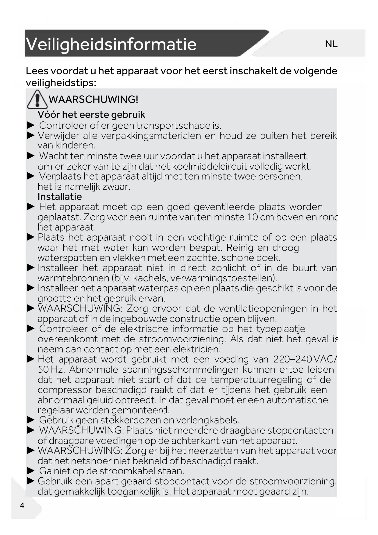 WAARSCHUWING! Vóór het eerste gebruik ► Controleer of er geen transportschade is. ► Verwijder alle verpakkingsmaterialen en houd ze buiten het bereik van kinderen. ► Wacht ten minste twee uur voordat u het apparaat installeert, om er zeker van te zijn dat het koelmiddelcircuit volledig werkt. ► Verplaats het apparaat altijd met ten minste twee personen, het is namelijk zwaar. Installatie ► Het apparaat moet op een goed geventileerde plaats worden geplaatst. Zorg voor een ruimte van ten minste 10 cm boven en rond het apparaat. ► Plaats het apparaat nooit in een vochtige ruimte of op een plaats waar het met water kan worden bespat. Reinig en droog waterspatten en vlekken met een zachte, schone doek. ► Installeer het apparaat niet in direct zonlicht of in de buurt van warmtebronnen (bijv. kachels, verwarmingstoestellen). ► Installeer het apparaat waterpas op een plaats die geschikt is voor de grootte en het gebruik ervan. ► WAARSCHUWING: Zorg ervoor dat de ventilatieopeningen in het apparaat of in de ingebouwde constructie open blijven. ► Controleer of de elektrische informatie op het typeplaatje overeenkomt met de stroomvoorziening. Als dat niet het geval is, neem dan contact op met een elektricien. ► Het apparaat wordt gebruikt met een voeding van 220–240 VAC/ 50 Hz. Abnormale spanningsschommelingen kunnen ertoe leiden dat het apparaat niet start of dat de temperatuurregeling of de compressor beschadigd raakt of dat er tijdens het gebruik een abnormaal geluid optreedt. In dat geval moet er een automatische regelaar worden gemonteerd. ► Gebruik geen stekkerdozen en verlengkabels. ► WAARSCHUWING: Plaats niet meerdere draagbare stopcontacten of draagbare voedingen op de achterkant van het apparaat. ► WAARSCHUWING: Zorg er bij het neerzetten van het apparaat voor dat het netsnoer niet bekneld of beschadigd raakt. ► Ga niet op de stroomkabel staan. ► Gebruik een apart geaard stopcontact voor de stroomvoorziening, dat gemakkelijk toegankelijk is. Het apparaat moet geaard zijn.NL Veiligheidsinformatie