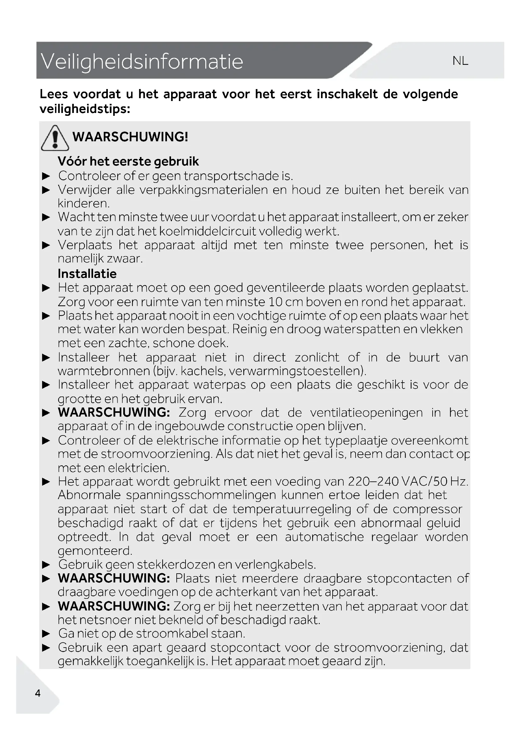 Veiligheidsinfor matie Lees voordat u het apparaat voor het eerst inschakelt de volgende veiligheidstips: WAARSCHUWING! Vóór het eerste gebruik ► Controleer of er geen transportschade is. ► Verwijder alle verpakkingsmaterialen en houd ze buiten het bereik van kinderen. ► Wacht ten minste twee uur voordat u het apparaat installeert, om er zeker van te zijn dat het koelmiddelcircuit volledig werkt. ► Verplaats het apparaat altijd met ten minste twee personen, het is namelijk zwaar. Installatie ► Het apparaat moet op een goed geventileerde plaats worden geplaatst. Zorg voor een ruimte van ten minste 10 cm boven en rond het apparaat. ► Plaats het apparaat nooit in een vochtige ruimte of op een plaats waar het met water kan worden bespat. Reinig en droog waterspatten en vlekken met een zachte, schone doek. ► Installeer het apparaat niet in direct zonlicht of in de buurt van warmtebronnen (bijv. kachels, verwarmingstoestellen). ► Installeer het apparaat waterpas op een plaats die geschikt is voor de grootte en het gebruik ervan. ► WAARSCHUWING: Zorg ervoor dat de ventilatieopeningen in het apparaat of in de ingebouwde constructie open blijven. ► Controleer of de elektrische informatie op het typeplaatje overeenkomt met de stroomvoorziening. Als dat niet het geval is, neem dan contact op met een elektricien. ► Het apparaat wordt gebruikt met een voeding van 220–240 VAC/50 Hz. Abnormale spanningsschommelingen kunnen ertoe leiden dat het apparaat niet start of dat de temperatuurregeling of de compressor beschadigd raakt of dat er tijdens het gebruik een abnormaal geluid optreedt. In dat geval moet er een automatische regelaar worden gemonteerd. ► Gebruik geen stekkerdozen en verlengkabels. ► WAARSCHUWING: Plaats niet meerdere draagbare stopcontacten of draagbare voedingen op de achterkant van het apparaat. ► WAARSCHUWING: Zorg er bij het neerzetten van het apparaat voor dat het netsnoer niet bekneld of beschadigd raakt. ► Ga niet op de stroomkabel staan. ► Gebruik een apart geaard stopcontact voor de stroomvoorziening, dat gemakkelijk toegankelijk is. Het apparaat moet geaard zijn.5