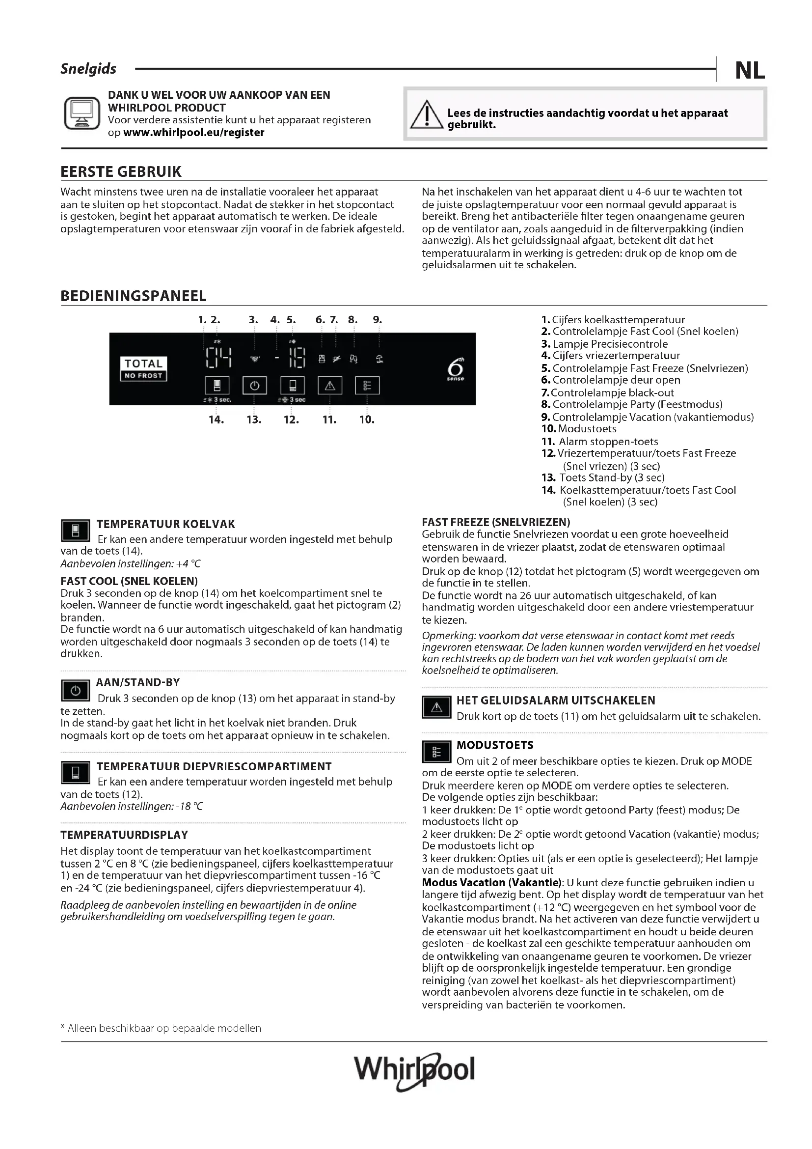 - Disponible sur certains modèles uniquement FRNL Snelgids DANK U WEL VOOR UW AANKOOP VAN EEN WHIRLPOOL PRODUCT Voor verdere assistentie kunt u het apparaat registeren op www.whirlpool.eu/register Lees de instructies aandachtig voordat u het apparaat gebruikt. EERSTE GEBRUIK Wacht minstens twee uren na de installatie vooraleer het apparaat aan te sluiten op het stopcontact. Nadat de stekker in het stopcontact is gestoken, begint het apparaat automatisch te werken. De ideale opslagtemperaturen voor etenswaar zijn vooraf in de fabriek afgesteld. Na het inschakelen van het apparaat dient u 4-6 uur te wachten tot de juiste opslagtemperatuur voor een normaal gevuld apparaat is bereikt. Breng het antibacteriële filter tegen onaangename geuren op de ventilator aan, zoals aangeduid in de filterverpakking (indien aanwezig). Als het geluidssignaal afgaat, betekent dit dat het temperatuuralarm in werking is getreden: druk op de knop om de geluidsalarmen uit te schakelen. BEDIENINGSPANEEL