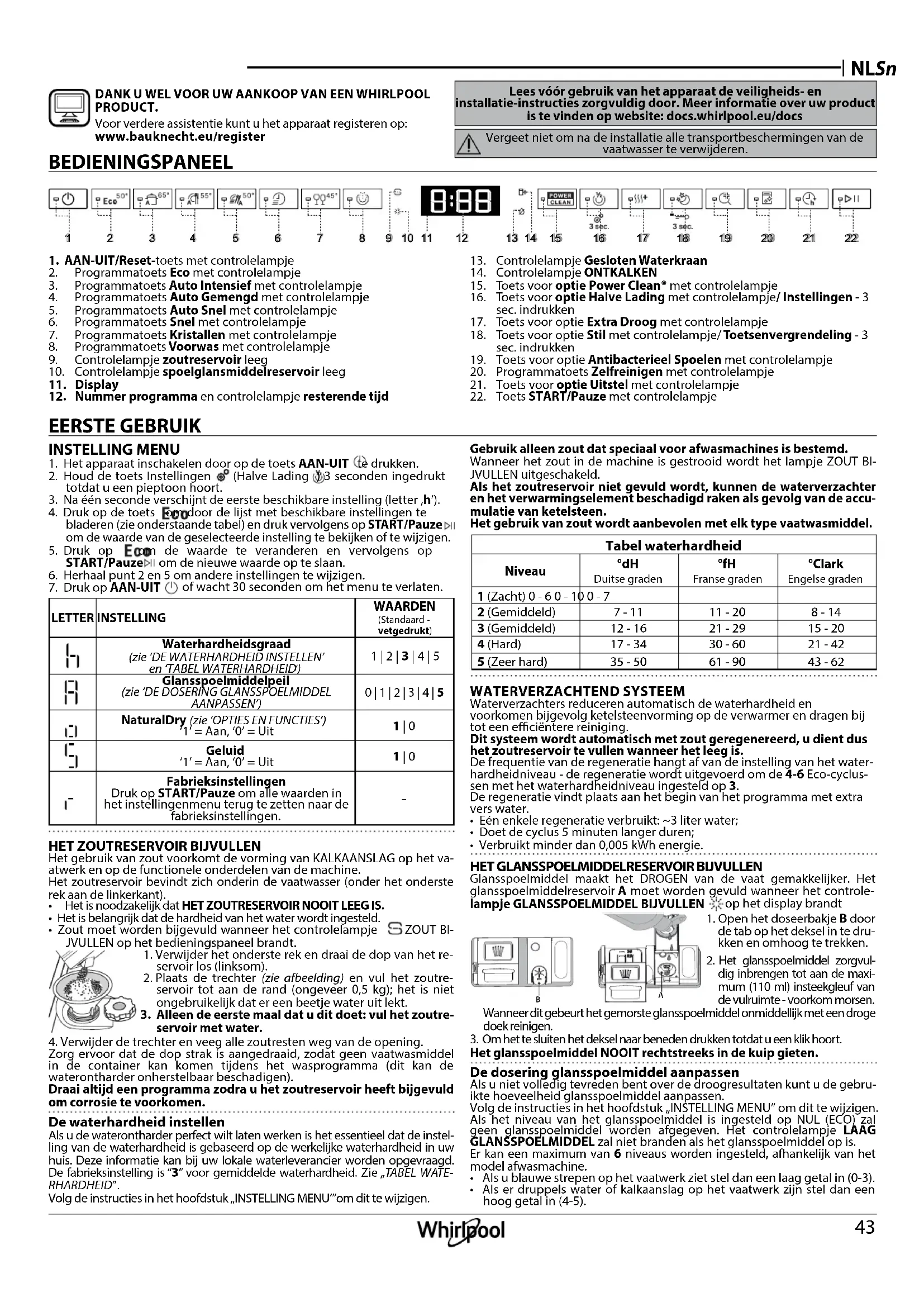 DANK U WEL VOOR UW AANKOOP VAN EEN WHIRLPOOL PRODUCT. Voor verdere assistentie kunt u het apparaat registeren op: www.bauknecht.eu/register EERSTE GEBRUIK Lees vóór gebruik van het apparaat de veiligheids- en installatie-instructies zorgvuldig door. Meer informatie over uw product is te vinden op website: docs.whirlpool.eu/docs Vergeet niet om na de installatie alle transportbeschermingen van de vaatwasser te verwijderen. INSTELLING MENU