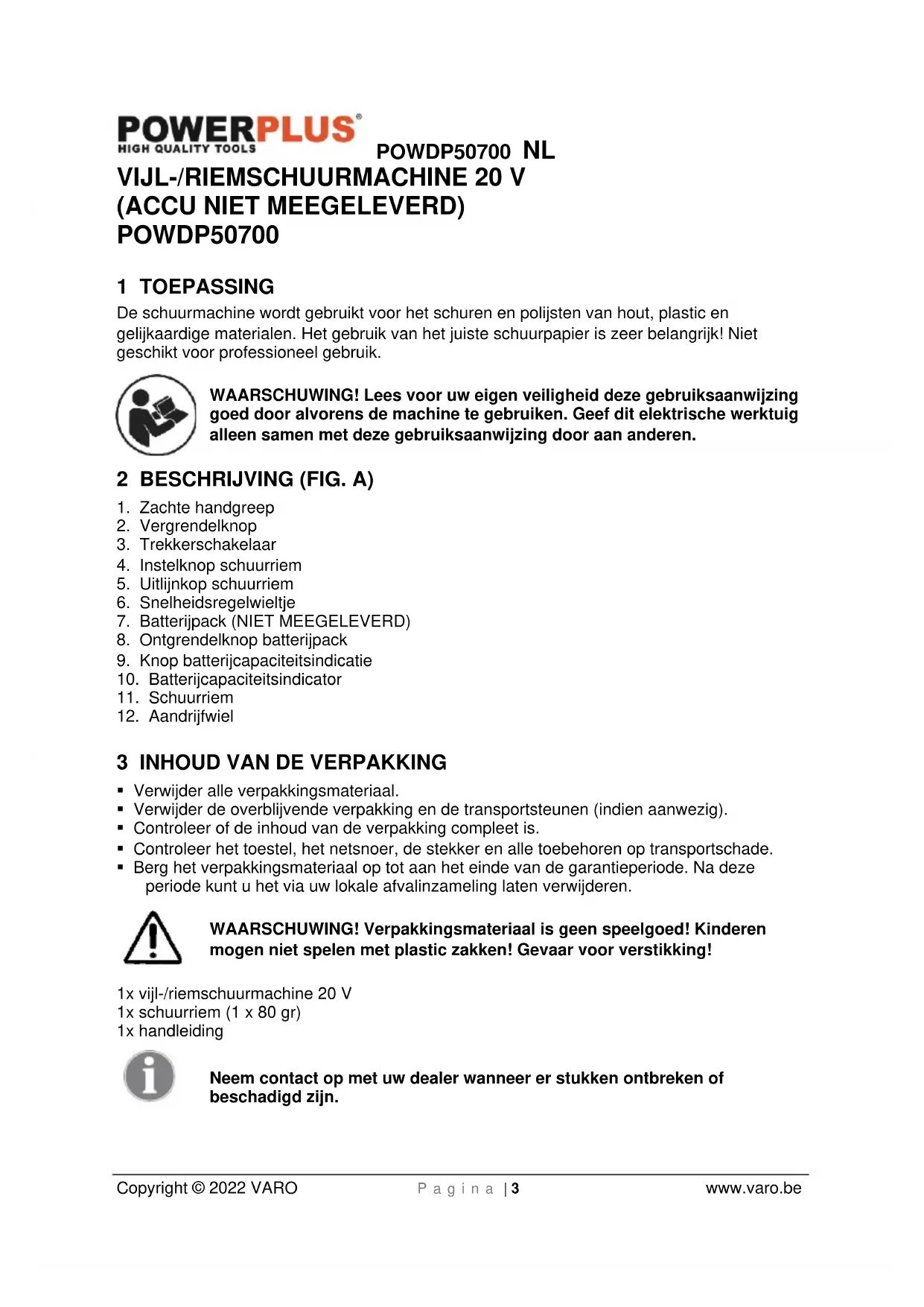 - Berg het verpakkingsmateriaal op tot aan het einde van de garantieperiode. Na deze periode kunt u het via uw lokale afvalinzameling laten verwijderen. WAARSCHUWING! Verpakkingsmateriaal is geen speelgoed! Kinderen mogen niet spelen met plastic zakken! Gevaar voor verstikking! 1x vijl-/riemschuurmachine 20 V 1x schuurriem (1 x 80 gr) 1x handleiding Neem contact op met uw dealer wanneer er stukken ontbreken of beschadigd zijn.POWDP50700 NL Copyright © 2022 VARO P a g i n a | 4 www.varo.be