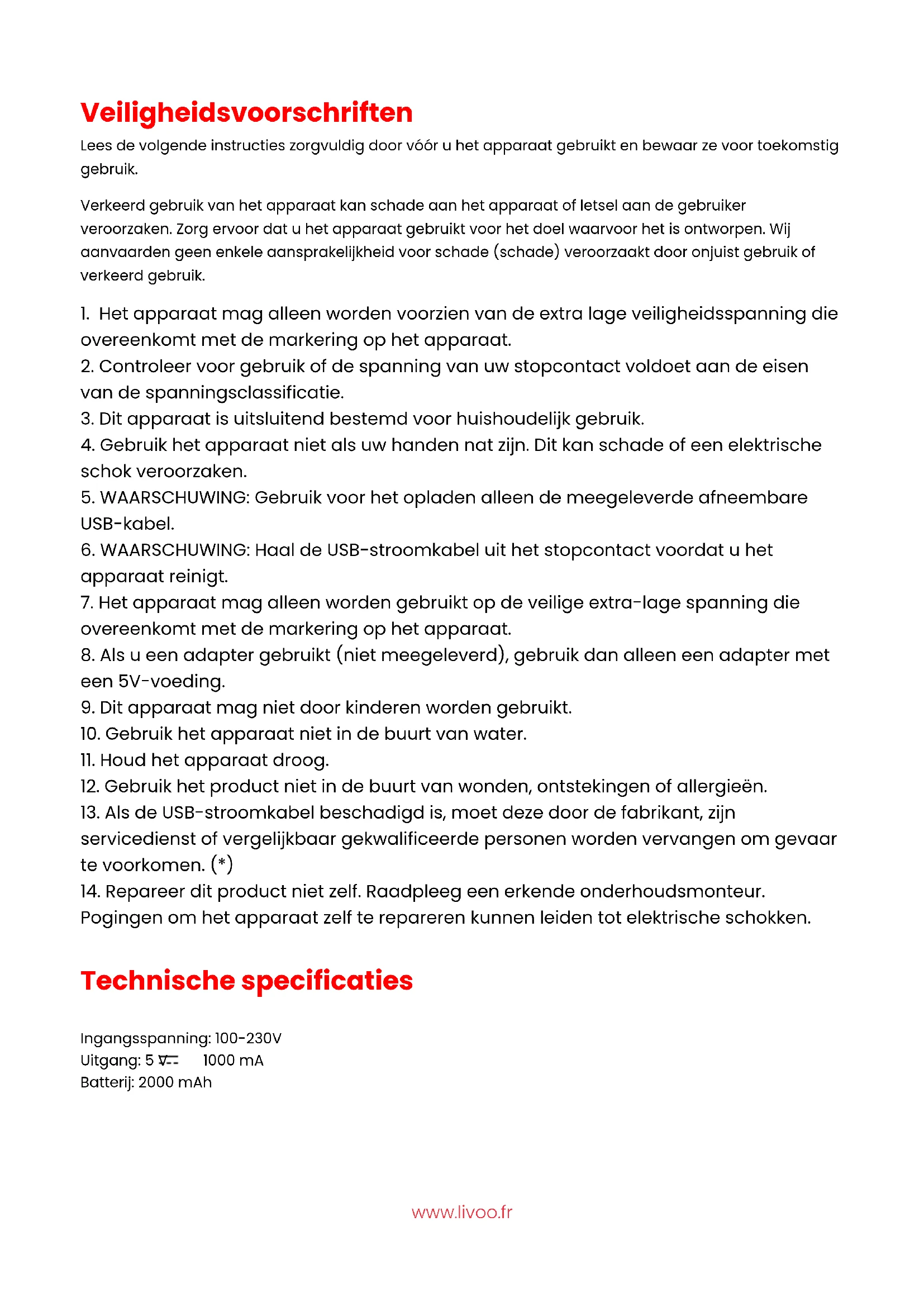 @livoo_officiel @Livoo @Livoowww.livoo.fr Veiligheidsvoorschriften Lees de volgende instructies zorgvuldig door vóór u het apparaat gebruikt en bewaar ze voor toekomstig gebruik. Verkeerd gebruik van het apparaat kan schade aan het apparaat of letsel aan de gebruiker veroorzaken. Zorg ervoor dat u het apparaat gebruikt voor het doel waarvoor het is ontworpen. Wij aanvaarden geen enkele aansprakelijkheid voor schade (schade) veroorzaakt door onjuist gebruik of verkeerd gebruik.