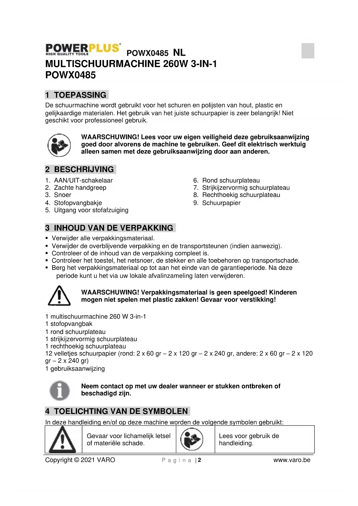 - ). Uw aankoopbon moet worden bewaard als bewijs van de aankoopdatum. Uw gereedschap moet als geheel naar uw dealer worden teruggebracht in een aanvaardbare staat van netheid, in zijn originele kunststof koffer (indien van toepassing op het product) en het moet vergezeld zijn van uw bewijs van aankoop.POWX0485 NL Copyright © 2021 VARO P a g i n a | 9 www.varo.be 14 MILIEU Als uw machine na verloop van tijd aan vervanging toe is, geef het dan niet met het huisvuil mee, maar zorg voor een milieuvriendelijke verwerking. Afval geproduceerd door elektrische machines mag niet behandeld worden als normaal huishoudelijk afval. Zorg voor recycling daar waar passende installaties bestaan. Raadpleeg de plaatselijke instanties of de verkoper voor adviezen over inzameling en verwerking. 15 CONFORMITEITSVERKLARING VARO N.V. - Vic. Van Rompuy N.V. – Joseph Van Instraat 9 - BE2500 Lier - BELGIUM, verklaart dat, Product: MULTISCHUURMACHINE 260 W 3-IN-1 Handelsmerk: POWERplus Model: POWX0485 voldoet aan de essentiële eisen en aan de overige relevante bepalingen van de van toepassing zijnde Europese Richtlijnen, gebaseerd op de toepassing van Europese geharmoniseerde normen. Elke niet-toegelaten modificatie van het apparaat maakt deze verklaring nietig. Europese Richtlijnen (inclusief, indien van toepassing, hun wijzigingen tot op de datum van ondertekening): 2011/65/EU 2006/42/EC 2014/30/EU Europese geharmoniseerde normen (inclusief, indien van toepassing, hun wijzigingen tot op de datum van ondertekening): EN62841-1 : 2015 EN62841-2-4 : 2014 EN55014-1 : 2017 EN55014-2 : 2015 EN61000-3-2 : 2014 EN61000-3-3 : 2013 Beheerder van de technische documentatie: Philippe Vankerkhove, VARO – Vic. Van Rompuy N.V. Ondergetekende handelt in opdracht van de bedrijfsleider, Philippe Vankerkhove Regelgevings- en compliancemanager 20/01/2021, Lier - BelgiumPOWX0485 FR Copyright © 2021 VARO P a g e | 1 www.varo.be 1 UTILISATION p. 2