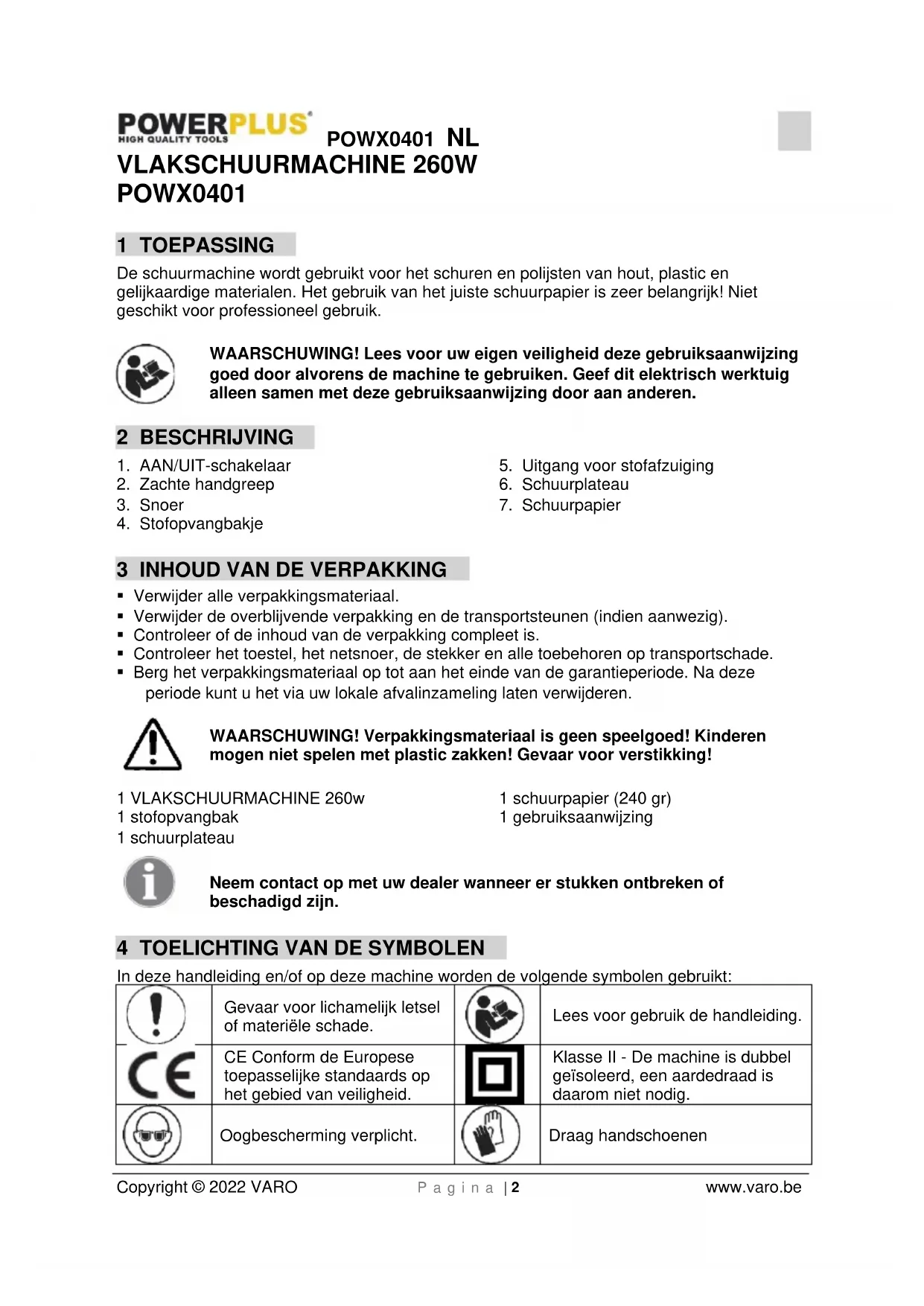 Copyright © 2022 VARO P a g i n a | 2 www.varo.be VLAKSCHUURMACHINE 260W POWX0401 1 TOEPASSING De schuurmachine wordt gebruikt voor het schuren en polijsten van hout, plastic en gelijkaardige materialen. Het gebruik van het juiste schuurpapier is zeer belangrijk! Niet geschikt voor professioneel gebruik. WAARSCHUWING! Lees voor uw eigen veiligheid deze gebruiksaanwijzing goed door alvorens de machine te gebruiken. Geef dit elektrisch werktuig alleen samen met deze gebruiksaanwijzing door aan anderen. 2 BESCHRIJVING