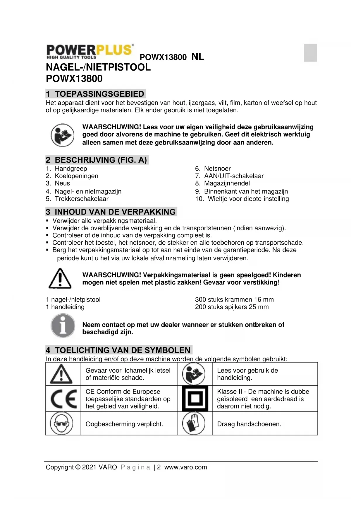 - Uw gereedschap moet als geheel naar uw dealer worden teruggebracht in een aanvaardbare staat van netheid, in zijn originele kunststof koffer (indien van toepassing op het product) en het moet vergezeld zijn van uw bewijs van aankoop. 14 MILIEU Wanneer uw machine na een lange gebruiksduur moet vervangen worden, werp ze dan niet bij het huishoudelijk afval maar doe dit op een milieuvriendelijke manier. Afval van elektrische machines mag niet op dezelfde manier behandeld worden als het gewone huishoudelijke afval. Breng het naar een plek waar het gerecycleerd kan worden. Raadpleeg de plaatselijke instanties of de verkoper voor adviezen over inzameling en verwerking.POWX13800 NL Copyright © 2021 VARO P a g i n a | 9 www.varo.com 15 CONFORMITEITSVERKLARING VARO N.V. - Vic. Van Rompuy N.V.- Joseph Van Instraat 9 - BE2500 Lier - BELGIUM, verklaart dat, Product: Nagel-/nietpistool Handelsmerk: POWERplus Model: POWX13800 voldoet aan de essentiële eisen en aan de overige relevante bepalingen van de van toepassing zijnde Europese Richtlijnen, gebaseerd op de toepassing van Europese geharmoniseerde normen. Elke niet-toegelaten modificatie van het apparaat maakt deze verklaring nietig. Europese Richtlijnen (inclusief, indien van toepassing, hun wijzigingen tot op de datum van ondertekening): 2011/65/EU 2006/42/EC 2014/30/EU Europese geharmoniseerde normen (inclusief, indien van toepassing, hun wijzigingen tot op de datum van ondertekening): EN60745-1 : 2009 EN60745-2-16 : 2010 EN55014-1 : 2017 EN55014-2 : 2015