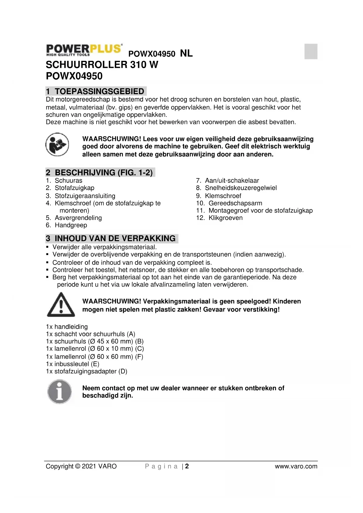 Verwijder alle verpakkingsmateriaal. Verwijder de overblijvende verpakking en de transportsteunen (indien aanwezig). Controleer of de inhoud van de verpakking compleet is. Controleer het toestel, het netsnoer, de stekker en alle toebehoren op transportschade. Berg het verpakkingsmateriaal op tot aan het einde van de garantieperiode. Na deze periode kunt u het via uw lokale afvalinzameling laten verwijderen. WAARSCHUWING! Verpakkingsmateriaal is geen speelgoed! Kinderen mogen niet spelen met plastic zakken! Gevaar voor verstikking! 1x handleiding 1x schacht voor schuurhuls (A) 1x schuurhuls (Ø 45 x 60 mm) (B) 1x lamellenrol (Ø 60 x 10 mm) (C) 1x lamellenrol (Ø 60 x 60 mm) (F) 1x inbussleutel (E) 1x stofafzuigingsadapter (D) Neem contact op met uw dealer wanneer er stukken ontbreken of beschadigd zijn.POWX04950 NL Copyright © 2021 VARO P a g i n a | 3 www.varo.com