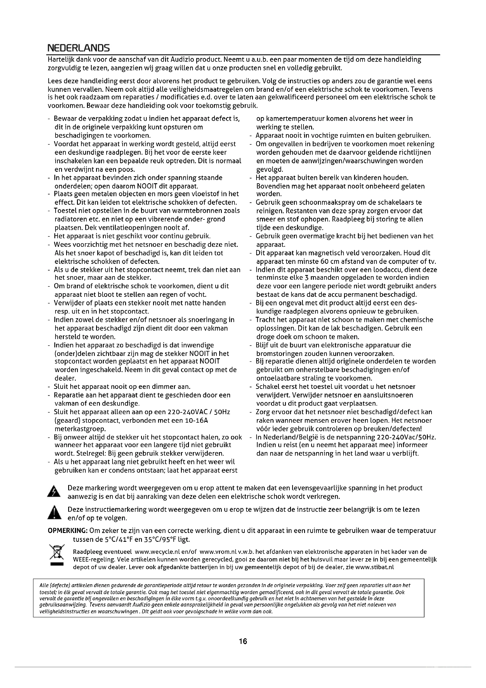 Alle (defecte) artikelen dienen gedurende de garantieperiode altijd retour te worden gezonden in de originele verpakking. Voer zelf geen reparaties uit aan het toestel; in élk geval vervalt de totale garantie. Ook mag het toestel niet eigenmachtig worden gemodificeerd, ook in dit geval vervalt de totale garantie. Ook vervalt de garantie bij ongevallen en beschadigingen in élke vorm t.g.v. onoordeelkundig gebruik en het niet in achtnemen van het gestelde in deze gebruiksaanwijzing. Tevens aanvaardt Audizio geen enkele aansprakelijkheid in geval van persoonlijke ongelukken als gevolg van het niet naleven van veiligheidsinstructies en waarschuwingen . Dit geldt ook voor gevolgschade in wélke vorm dan ook.17 LET OP! Onmiddellijk na ontvangst, zorgvuldig uitpakken van de doos, controleer de inhoud om ervoor te zorgen dat alle onderdelen aanwezig zijn en zijn in goede staat zijn ontvangen. Bij transportschade of ontbreken van onderdelen onmiddellijk de verkopende partij inlichten. Bewaar de verpakking en het verpakkingsmateriaal. Indien het product moet worden teruggestuurd, is het belangrijk dat het product in originele verpakking wordt geretourneerd. Als het apparaat is blootgesteld aan drastische temperatuurverschillen (bv. na het transport), schakel het apparaat niet onmiddellijk in. De ontstane condensatie kan het apparaat beschadigen. Zorg ervoor dat het apparaat op kamertemperatuur komt en steek vervolgens de voeding stekker in het stopcontact/wandcontactdoos.