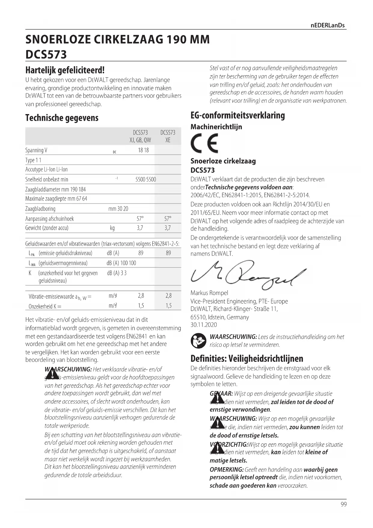 per maggioriinformazioni.99 nEDERLanDs WAARSCHUWING: Lees de instructiehandleiding om het risico op letsel teverminderen. Definities: Veiligheidsrichtlijnen De definities hieronder beschrijven de ernstgraad voor elk signaalwoord. Gelieve de handleiding te lezen en op deze symbolen teletten. GEVAAR: Wijst op een dreigende gevaarlijke situatie die, indien niet vermeden, zal leiden tot de dood of ernstigeverwondingen. WAARSCHUWING: Wijst op een mogelijk gevaarlijke situatie die, indien niet vermeden, zou kunnen leiden tot de dood of ernstigeletsels. VOORZICHTIG:Wijst op een mogelijk gevaarlijke situatie die, indien niet vermeden, kan leiden tot kleine of matigeletsels. OPMERKING: Geeft een handeling aan waarbij geen persoonlijk letsel optreedt die, indien niet voorkomen, schade aan goederen kanveroorzaken. EG‑conformiteitsverklaring Machinerichtlijn Snoerloze cirkelzaag DCS573 DeWALT verklaart dat de producten die zijn beschreven onderTechnische gegevens voldoen aan: 2006/42/EC, EN62841‑1:2015, EN62841‑2‑5:2014.Deze producten voldoen ook aan Richtlijn 2014/30/EU en 2011/65/EU. Neem voor meer informatie contact op met DeWALT op het volgende adres of raadpleeg de achterzijde van dehandleiding.De ondergetekende is verantwoordelijk voor de samenstelling van het technische bestand en legt deze verklaring af namensDeWALT.Markus Rompel Vice‑President Engineering, PTE‑ Europe DeWALT, Richard‑Klinger‑ Straße 11, 65510, Idstein, Germany 30.11.2020Stel vast of er nog aanvullende veiligheidsmaatregelen zijn ter bescherming van de gebruiker tegen de effecten van trilling en/of geluid, zoals: het onderhouden van gereedschap en de accessoires, de handen warm houden (relevant voor trilling) en de organisatie vanwerkpatronen.Het vibratie‑ en/of geluids‑emissieniveau dat in dit informatieblad wordt gegeven, is gemeten in overeenstemming met een gestandaardiseerde test volgens EN62841en kan worden gebruikt om het ene gereedschap met het andere te vergelijken. Het kan worden gebruikt voor een eerste beoordeling vanblootstelling. WAARSCHUWING: Het verklaarde vibratie- en/of geluids-emissieniveau geldt voor de hoofdtoepassingen van het gereedschap. Als het gereedschap echter voor andere toepassingen wordt gebruikt, dan wel met andere accessoires, of slecht wordt onderhouden, kan de vibratie- en/of geluids-emissie verschillen. Dit kan het blootstellingsniveau aanzienlijk verhogen gedurende de totalewerkperiode.Bij een schatting van het blootstellingsniveau aan vibratie- en/of geluid moet ook rekening worden gehouden met de tijd dat het gereedschap is uitgeschakeld, of aanstaat maar niet werkelijk wordt ingezet bij werkzaamheden. Dit kan het blootstellingsniveau aanzienlijk verminderen gedurende de totalearbeidsduur.DCS573 XJ, GB, QWDCS573 Spanning V 18 18Type 1 1Accutype Li‑Ion Li‑IonSnelheid onbelast min 5500 5500Zaagbladdiameter mm 190 184Maximale zaagdiepte mm 67 64Zaagbladboring mm 30 20Aanpassing afschuinhoek 57° 57° Gewicht (zonder accu) kg 3,7 3,7 Geluidswaarden en/of vibratiewaarden (triax‑vectorsom) volgens EN62841‑2‑5: