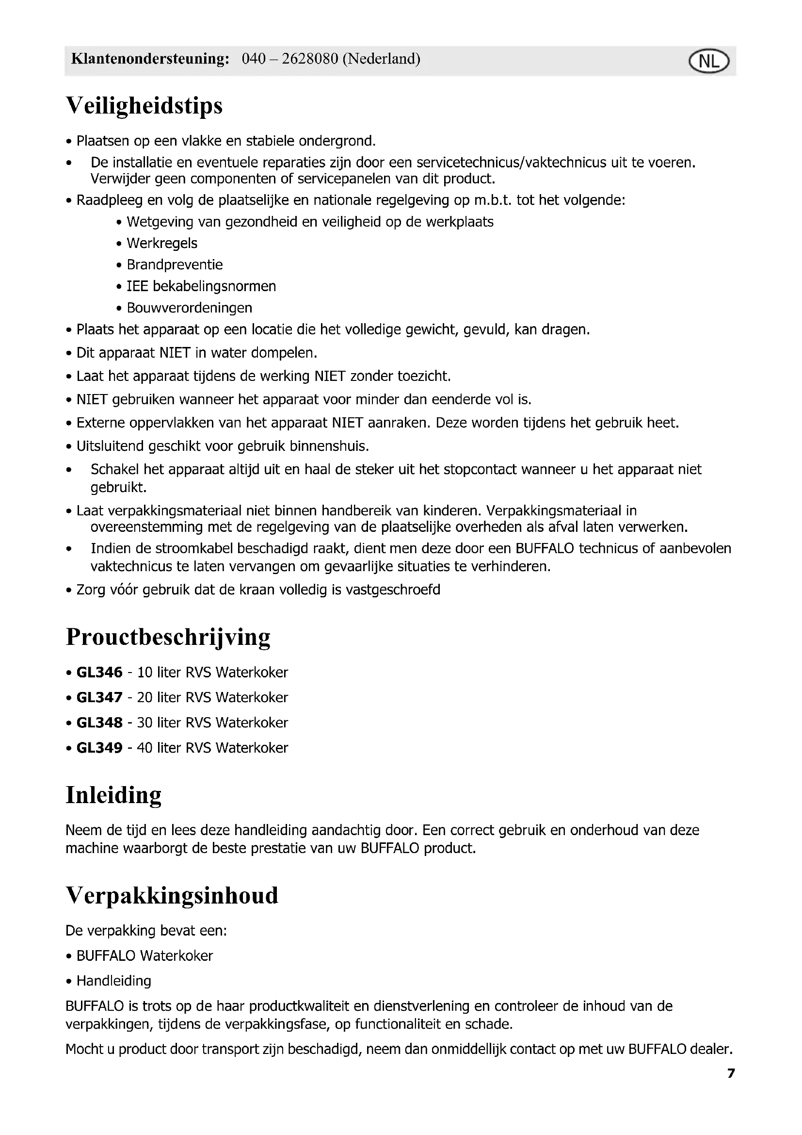 - Aardekabel (groen/geel) naar de aansluitklem gemarkeerd met E Dit apparaat moet worden geaard met behulp van een adequaat aardingscircuit. Bij twijfels raadpleeg een vakkundige elektricien. De elektrische isolatiepunten mogen niet worden geblokkeerd. In geval van een nooduitschakeling moeten de isolatiepunten direct toegankelijk zijn. Productconformiteit Het WEEE-logo op dit product of bijbehorende documentatie geeft aan dat het product niet onder huisvuil valt en als zodanig ook niet mag worden verwerkt. Ter preventie van mogelijke gevaren voor de gezondheid van personen en/of voor het milieu, dient men dit product in overeenstemming met het voorgeschreven en milieuveilige recyclingproces als afval te verwerken. Raadpleeg uw productleverancier of uw plaatselijk afvalverwerkingsbedrijf voor meer informatie over de juiste afvalverwerking van dit product. De onderdelen van BUFFALO producten hebben strenge producttesten ondergaan om te voldoen aan wettelijke regels en specificaties die door internationale, onafhankelijke en landelijke overheden worden voorgeschreven. BUFFALO producten zijn goedgekeurd en voorzien van het volgende symbool: le rechten voorbehouden. Het is verboden om deze handleiding, hetzij volledig of gedeeltelijk, elektronisch of mechanisch te reproduceren, kopiëren, op opslagmedia op te slaan of op enigerlei wijze over te dragen, zonder voorafgaande goedkeuring van BUFFALO. Wij hebben er alles aan gedaan om er zeker van te zijn dat op publicatiedatum van de handleiding alle details correct zijn, des- ondanks, behoudt BUFFALO het recht voor om specificaties zonder aankondiging te wijzigen. Model Voltage Vermogen Stroom Inhoud Gewicht (vol) Gemiddelde verwarmings duur (vol op max. temp.) Afmetingen h x b x d mm GL346 230V 50Hz 2600W 11.3A 10 litres 16.8kgs 22 minuut 470x313x326 GL347 230V 50Hz 2600W 11.3A 20 litres 29.2kgs 45 minuut 535x369x380 GL348 230V 50Hz 2600W 11.3A 30 litres 40.4kgs 60 minuut 519x433x440 GL349 230V 50Hz 2600W 11.3A 40 litres 48.2kgs 89 minuut 630x433x44012