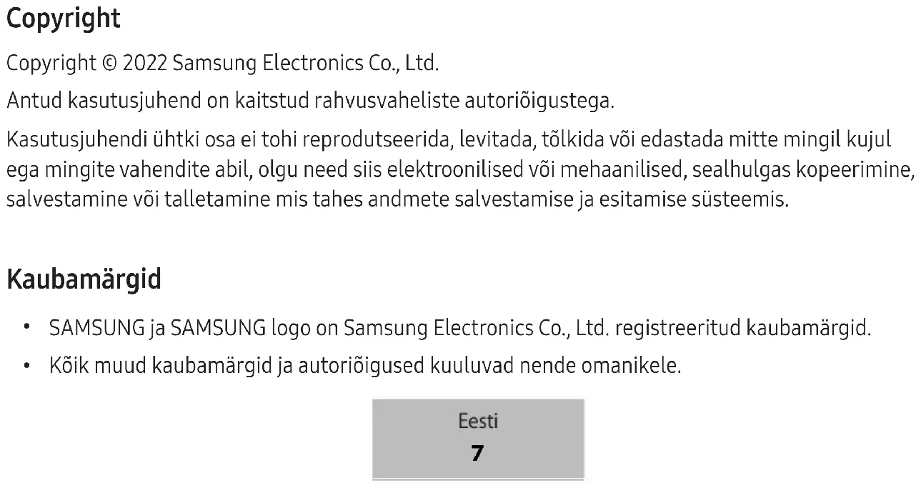 De beschikbaarheid van alle accessoires is onderhevig aan wijzigingen die volledig afhankelijk zijn van de fabrikanten. Ga naar de website van Samsung voor meer informatie over de beschikbare accessoires. Nederlands 6Drukfouten voorbehouden. Copyright Copyright © 2022 Samsung Electronics Co., Ltd. Deze gebruiksaanwijzing is beschermd onder internationale auteursrechtwetten. Geen enkel onderdeel van deze gebruiksaanwijzing mag worden gereproduceerd, gedistribueerd, vertaald of verzonden in welke vorm dan ook of op welke elektronische of mechanische wijze dan ook, inclusief door deze te fotokopiëren, op te nemen of op te slaan in een systeem voor het opslaan en ophalen van informatie. Handelsmerken