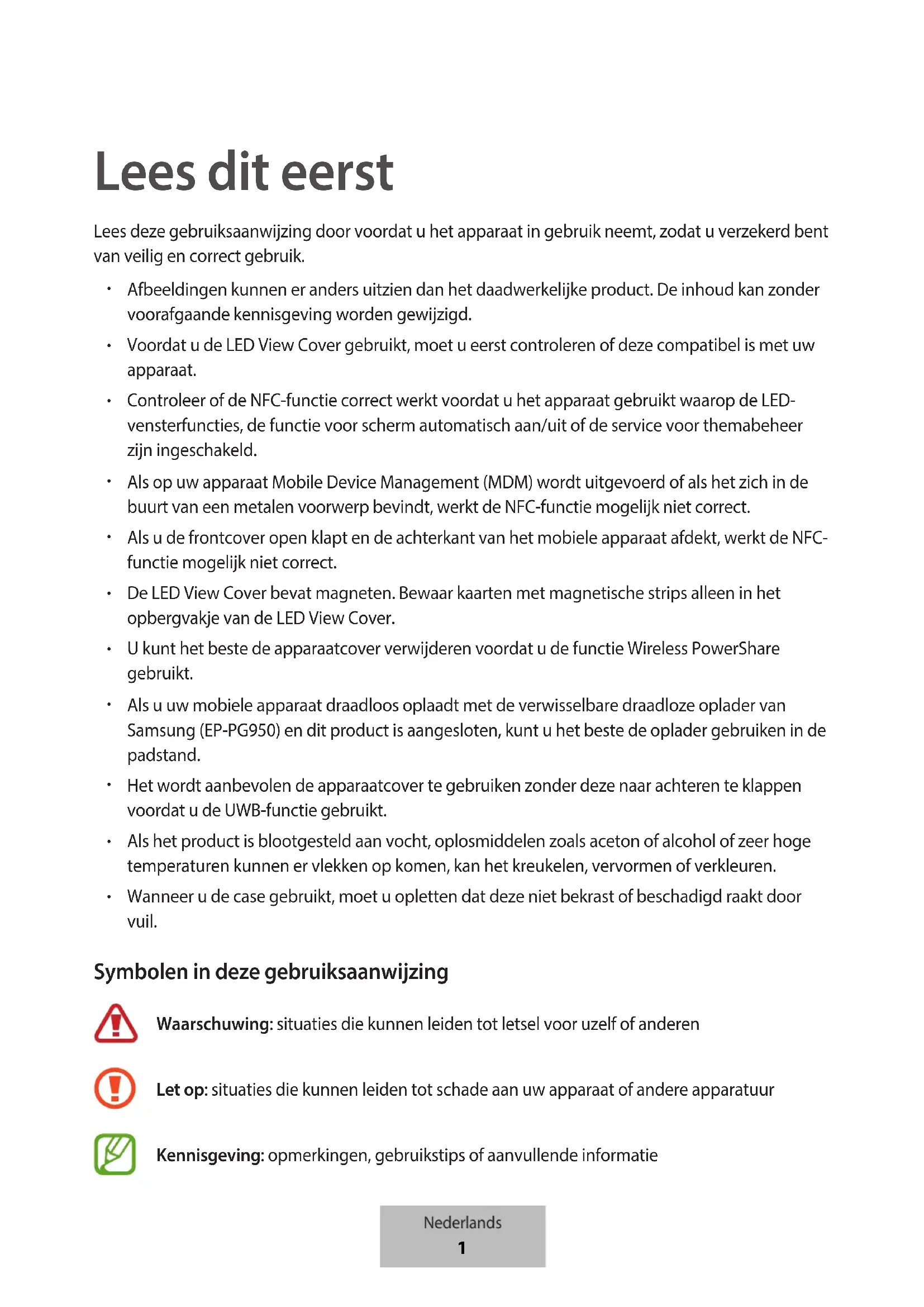 Accessoires en gebruik vervolgens de editor-functie voor LED-pictogrammen. U kunt ook de editor-app voor LED-pictogrammen gebruiken die wordt weergegeven wanneer u de LED View Cover bevestigt aan het mobiele apparaat. Nederlands 6Drukfouten voorbehouden. Copyright Copyright © 2020 Samsung Electronics Co., Ltd. Deze gebruiksaanwijzing is beschermd onder internationale auteursrechtwetten. Geen enkel onderdeel van deze gebruiksaanwijzing mag worden gereproduceerd, gedistribueerd, vertaald of verzonden in welke vorm dan ook of op welke elektronische of mechanische wijze dan ook, inclusief door deze te fotokopiëren, op te nemen of op te slaan in een systeem voor het opslaan en ophalen van informatie. Handelsmerken