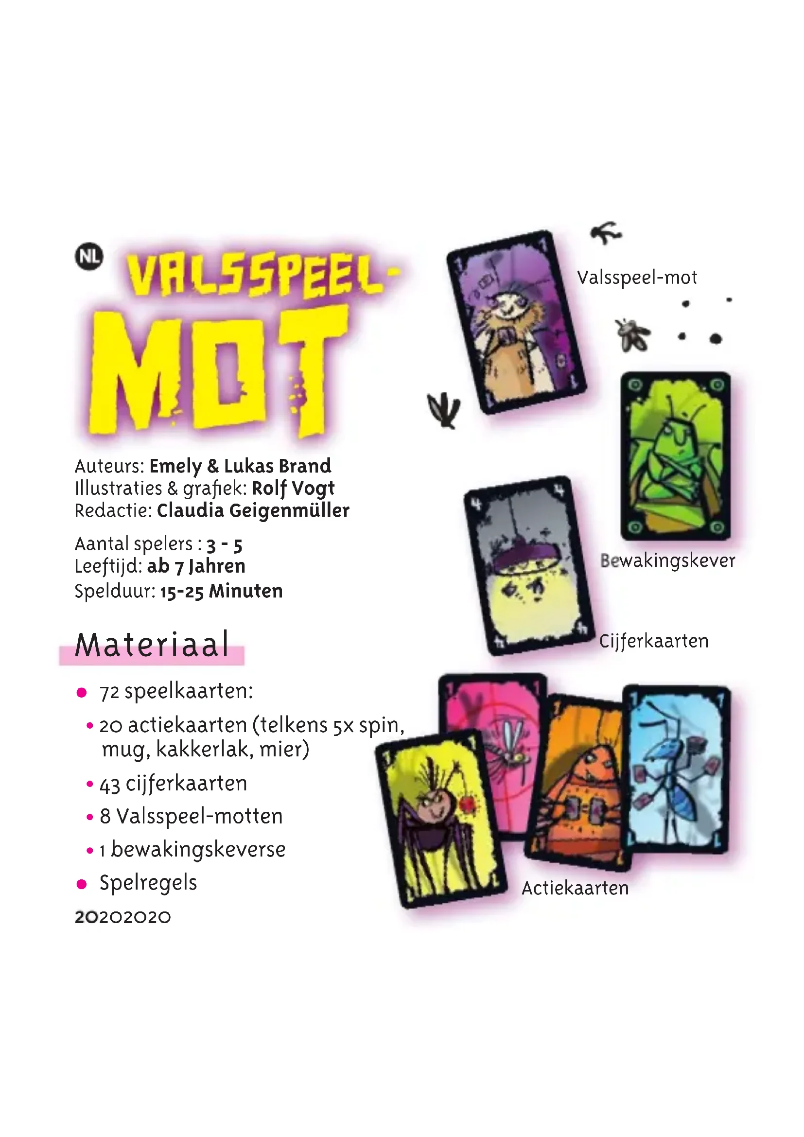 Spin Wie een spin uitspeelt, mag aansluitend meteen nog een van zijn handkaarten (maar geen valsspeel-mot) weggeven aan een willekeurige medespeler. Mug Als de mug wordt uitgespeeld, dan slaan allen, uitgezonderd de actieve speler, zo snel mogelijk met de vlakke hand op de mug-kaart. De traagste speler krijgt van elke medespeler een handkaart (maar geen valsspeel-mot). Kakkerlak Als er een kakkerlak wordt uitgespeeld, dan proberen alle spelers gelijktijdig een willekeurige cijferkaart met dezelfde waarde daarop te leggen. Alleen de snelste mag zijn kaart laten liggen. Als niemand aan kaart kan afleggen, wordt er gewoon verder gespeeld. Actiekaarten ... worden gespeeld volgens de aflegregels. MogelMotte_Anl_04.indd 24 20.07.11 12:55Als de afneemstapel leeg is, wordt de aflegstapel gemengd en gebruikt als nieuwe afneemstapel. Einde van de ronde Als een speler geen handkaart meer in handen heeft is de ronde afgelopen. Telling van de ronde Elke cijferkaart telt voor 1 minpunt, elke actiekaart voor 5 minpunten en elke valsspeel-mot voor 10 minpunten. In de volgende ronde krijgt de speler, die links naast de startspeler van de afgelopen ronde zit, de bewakingskever. Speleinde Er worden zoveel ronden gespeeld als er spelers zijn. Wie aan het einde het minst minpunten heeft, wint het spel!