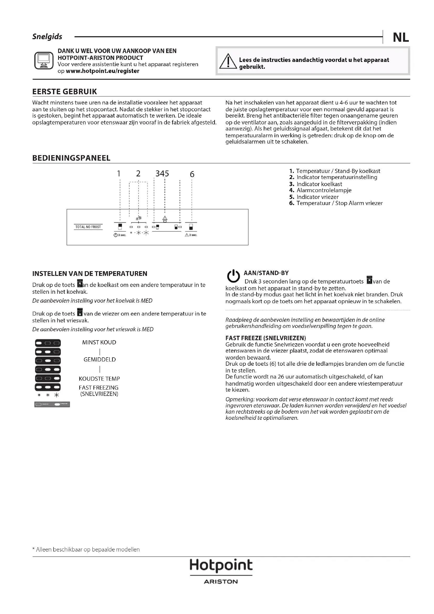 - Disponible sur certains modèles uniquement FRNL Snelgids DANK U WEL VOOR UW AANKOOP VAN EEN HOTPOINT-ARISTON PRODUCT Voor verdere assistentie kunt u het apparaat registeren op www.hotpoint.eu/register Lees de instructies aandachtig voordat u het apparaat gebruikt. EERSTE GEBRUIK Wacht minstens twee uren na de installatie vooraleer het apparaat aan te sluiten op het stopcontact. Nadat de stekker in het stopcontact is gestoken, begint het apparaat automatisch te werken. De ideale opslagtemperaturen voor etenswaar zijn vooraf in de fabriek afgesteld. Na het inschakelen van het apparaat dient u 4-6 uur te wachten tot de juiste opslagtemperatuur voor een normaal gevuld apparaat is bereikt. Breng het antibacteriële lter tegen onaangename geuren op de ventilator aan, zoals aangeduid in de lterverpakking (indien aanwezig). Als het geluidssignaal afgaat, betekent dit dat het temperatuuralarm in werking is getreden: druk op de knop om de geluidsalarmen uit te schakelen. BEDIENINGSPANEEL