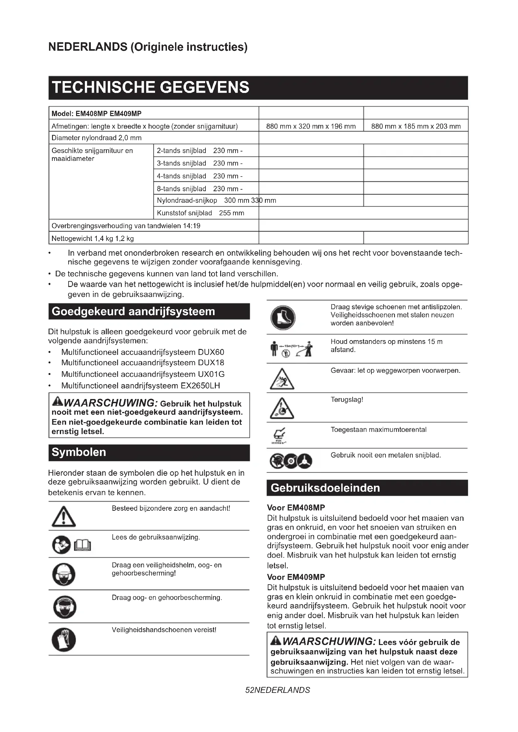 Aandrijfsysteem Raadpleegdegebruiksaanwijzingvanhetaandrijfsysteem.62 NEDERLANDS PROBLEMEN OPLOSSEN Alvorens om reparatie te vragen, voert u eerst uw eigen inspectie uit. Als u een probleem ondervindt dat niet wordt beschrevenindezegebruiksaanwijzing,magunietproberenhetapparaattedemonteren.Inplaatsdaarvanvraagtu eenerkendMakita-servicecentrum,dataltijdMakita-vervangingsonderdelengebruikt,omhetapparaatterepareren. Probleemomschrijving Waarschijnlijke oorzaak (storing) Oplossing De motor start niet. - Raadpleegdegebruiksaanwijzingvanhet aandrijfsysteem. De motor stopt spoedig. - Raadpleegdegebruiksaanwijzingvanhet aandrijfsysteem. Het motortoerental neemt niet toe. - Raadpleegdegebruiksaanwijzingvanhet aandrijfsysteem. Hetsnijgarnituurdraaitniet. Zetdemotoronmiddellijkuit. Hetsnijgarnituurzitlos. Draai stevig vast. Eentwijgzitvastinhetsnijgarnituur. Verwijderhetvreemdevoorwerp. Probleemmethetaandrijfsysteem Neem contact op met een erkend servicecentrum voor reparatie. De motor trilt abnormaal. Zetdemotoronmiddellijkuit. Kapot, verbogen of versleten snijgarnituur Vervanghetsnijgarnituur. Hetsnijgarnituurzitlos. Draai stevig vast. Eénuiteindevandenylonsnijdraadis gebrokenendenylondraad-snijkopis uit balans geraakt. Voerdenylonsnijdraadaandoordenylon- draad-snijkopopdegrondtetikken. Hetsnijgarnituurisverkeerdbevestigd. Bevestigopdejuistewijze. Probleemmethetaandrijfsysteem Neem contact op met een erkend servicecentrum voor reparatie. Hetsnijbladstoptnietonmiddellijk. Zetdemotoronmiddellijkuit. Hetaandrijfsysteemwerktnietgoed. Raadpleegdegebruiksaanwijzingvanhet aandrijfsysteem. Denylonsnijdraadwordtniet aangevoerd. De draad is op of zit in de knoop bin- nenin de spoel. Wikkel de draad opnieuw op. Denylonsnijdraadwordtnietopde juistelengteafgesneden. Hetmesjeopdebeschermkapis beschadigd of ontbreekt. Neem contact op met een erkend servicecentrum voor reparatie. Dedraadsteektuittotvoorbijde beschermkap. Wikkel de draad opnieuw op.63 ESPAÑOL ESPAÑOL (Instrucciones originales) ESPECIFICACIONES Modelo: EM408MP EM409MP Dimensiones: longitud x anchura x altura (sin implemento de corte) 880 mm x 320 mm x 196 mm 880 mm x 185 mm x 203 mm Diámetro del cordón de nylon 2,0 mm Implemento de corte aplicable y diámetro del corte Disco de 2 dientes 230 mm - Disco de 3 dientes 230 mm - Disco de 4 dientes 230 mm - Disco de 8 dientes 230 mm - Cabezal de corte de nylon 300 mm 330 mm Cuchilla de plástico 255 mm Relación de transmisión 14:19 Peso neto 1,4 kg 1,2 kg