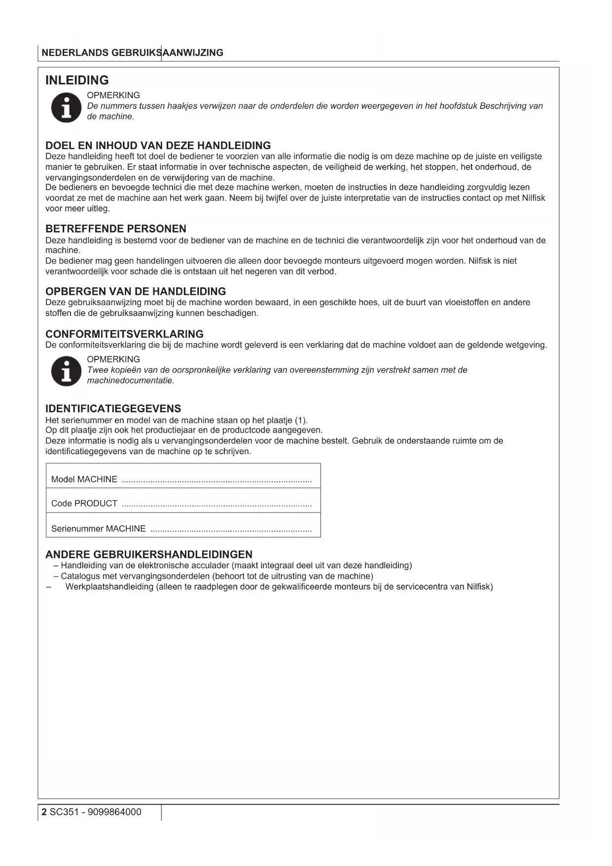 Deze gebruiksaanwijzing moet bij de machine worden bewaard, in een geschikte hoes, uit de buurt van vloeistoffen en andere stoffen die de gebruiksaanwijzing kunnen beschadigen. CONFORMITEITSVERKLARING De conformiteitsverklaring die bij de machine wordt geleverd is een verklaring dat de machine voldoet aan de geldende wetgeving. OPMERKING Twee kopieën van de oorspronkelijke verklaring van overeenstemming zijn verstrekt samen met de machinedocumentatie. IDENTIFICATIEGEGEVENS Het serienummer en model van de machine staan op het plaatje (1). Op dit plaatje zijn ook het productiejaar en de productcode aangegeven. Deze informatie is nodig als u vervangingsonderdelen voor de machine bestelt. Gebruik de onderstaande ruimte om de identicatiegegevens van de machine op te schrijven. Model MACHINE ............................................................................... Code PRODUCT ............................................................................... Serienummer MACHINE ................................................................... ANDERE GEBRUIKERSHANDLEIDINGEN – Handleiding van de elektronische acculader (maakt integraal deel uit van deze handleiding) – Catalogus met vervangingsonderdelen (behoort tot de uitrusting van de machine) – Werkplaatshandleiding (alleen te raadplegen door de gekwaliceerde monteurs bij de servicecentra van Nilsk)GEBRUIKSAANWIJZING NEDERLANDS 9099864000 - SC351 3