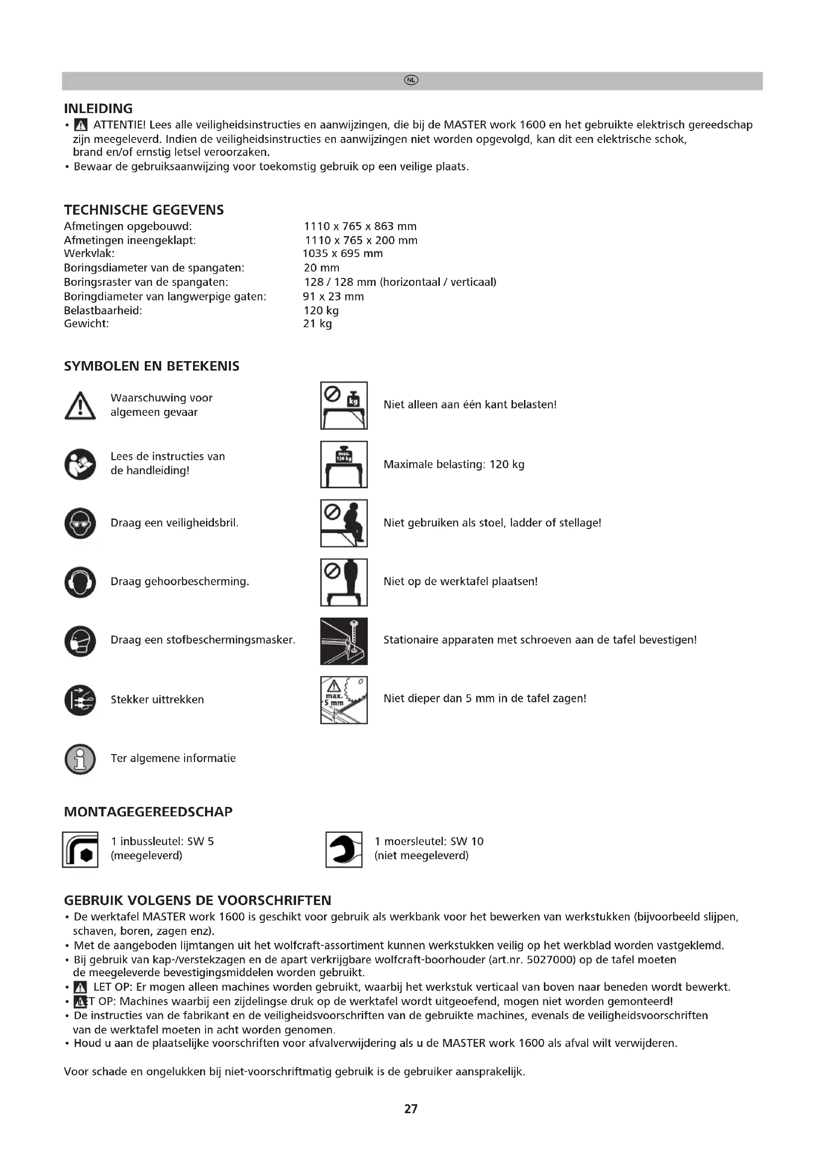 - Bewaar de gebruiksaanwijzing voor toekomstig gebruik op een veilige plaats. TECHNISCHE GEGEVENS Afmetingen opgebouwd: 1110 x 765 x 863 mm Afmetingen ineengeklapt: 1110 x 765 x 200 mm Werkvlak: 1035 x 695 mm Boringsdiameter van de spangaten: 20 mm Boringsraster van de spangaten: 128 / 128 mm (horizontaal / verticaal) Boringdiameter van langwerpige gaten: 91 x 23 mm Belastbaarheid: 120 kg Gewicht: 21 kg