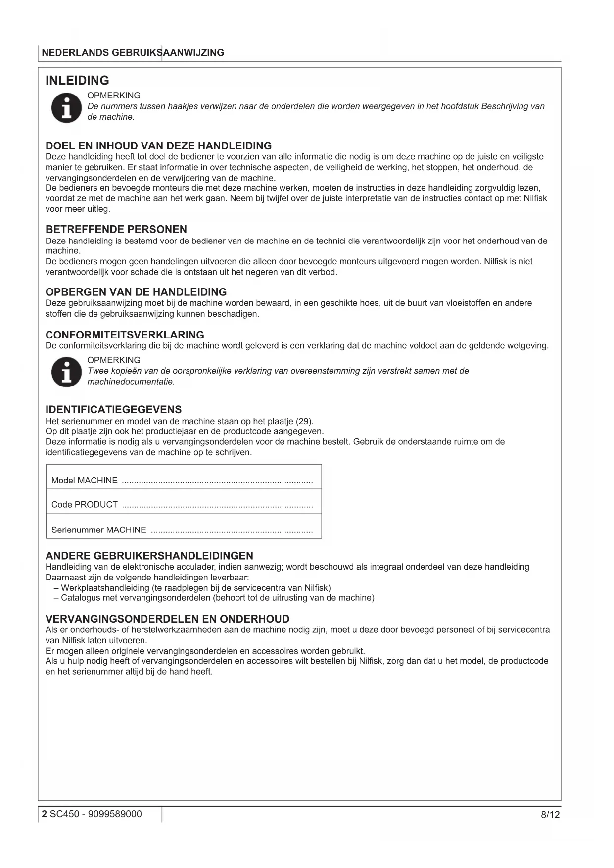 Als er onderhouds- of herstelwerkzaamheden aan de machine nodig zijn, moet u deze door bevoegd personeel of bij servicecentra van Nilsk laten uitvoeren. Er mogen alleen originele vervangingsonderdelen en accessoires worden gebruikt. Als u hulp nodig heeft of vervangingsonderdelen en accessoires wilt bestellen bij Nilsk, zorg dan dat u het model, de productcode en het serienummer altijd bij de hand heeft.GEBRUIKSAANWIJZING NEDERLANDS 9099589000 - SC450 3 8/12