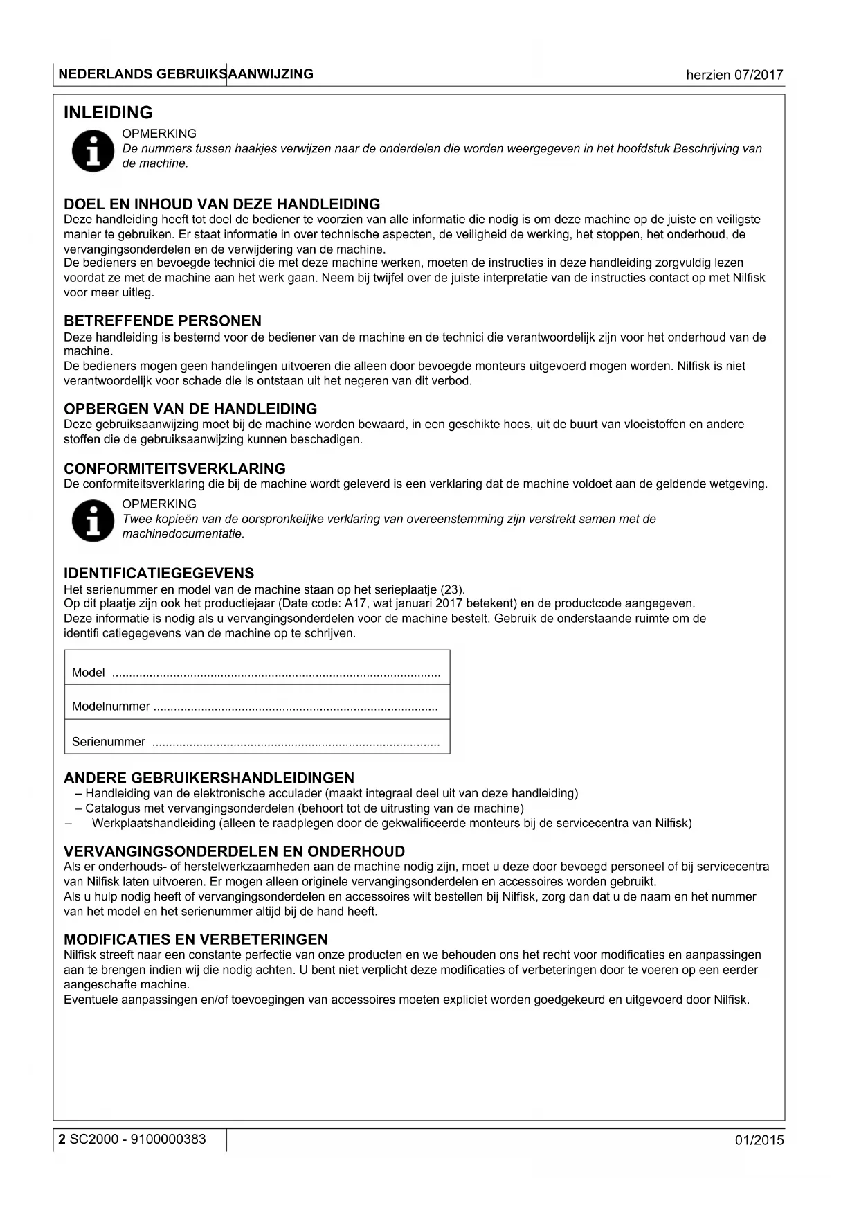 Nilfi sk streeft naar een constante perfectie van onze producten en we behouden ons het recht voor modifi caties en aanpassingen aan te brengen indien wij die nodig achten. U bent niet verplicht deze modifi caties of verbeteringen door te voeren op een eerder aangeschafte machine. Eventuele aanpassingen en/of toevoegingen van accessoires moeten expliciet worden goedgekeurd en uitgevoerd door Nilfi sk.GEBRUIKSAANWIJZING NEDERLANDS 9100000383 - SC2000 3 01/2015 herzien 07/2017 BEDRIJFSCAPACITEIT De schrobmachine SC2000 is ontwikkeld en gebouwd voor het reinigen (wassen en drogen) van gladde en solide vloeren in bedrijfs- en winkelruimten onder veilige omstandigheden. De machine moet door een bevoegde bediener worden gebruikt. De schrobmachine is niet geschikt voor het reinigen van kleden of tapijt. ALGEMENE OPMERKINGEN Alle verwijzingen naar voorwaarts en achterwaarts, vóór en achter, rechts en links in deze handleiding zijn vanuit de bediener in zijn rijpositie op de stoel bekeken (12).