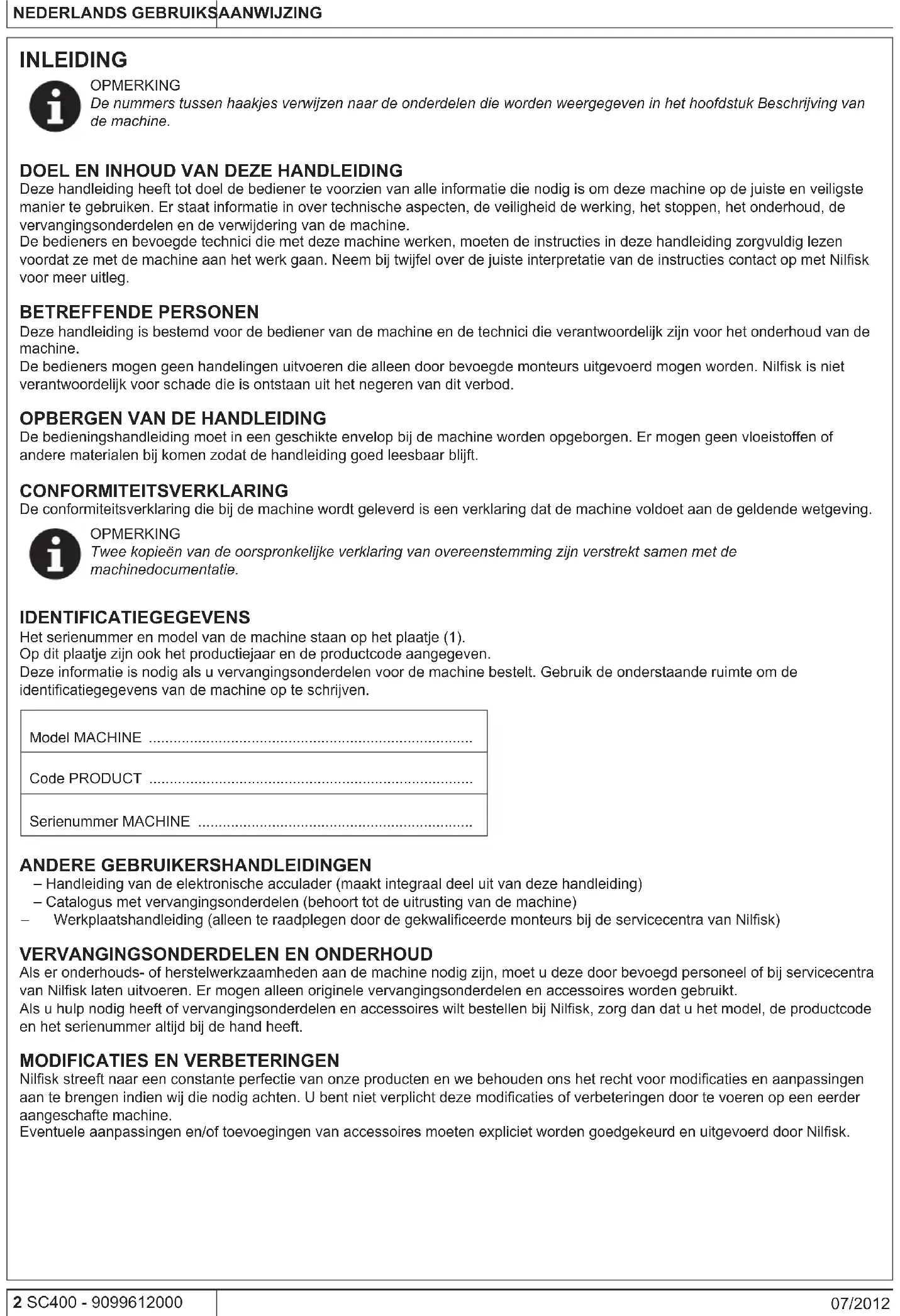 Nilsk streeft naar een constante perfectie van onze producten en we behouden ons het recht voor modicaties en aanpassingen aan te brengen indien wij die nodig achten. U bent niet verplicht deze modicaties of verbeteringen door te voeren op een eerder aangeschafte machine. Eventuele aanpassingen en/of toevoegingen van accessoires moeten expliciet worden goedgekeurd en uitgevoerd door Nilsk.GEBRUIKSAANWIJZING NEDERLANDS 9099612000 - SC400 3 07/2012 BEDRIJFSCAPACITEIT Deze schrobmachines zijn ontwikkeld en gebouwd voor het reinigen (wassen en drogen) van gladde en solide vloeren in openbare en bedrijfsruimten onder veilige omstandigheden en moeten door een bevoegde bediener worden gebruikt. Deze schrobmachines zijn niet geschikt voor het reinigen van tapijten of vloerbedekking. ALGEMENE OPMERKINGEN Alle verwijzingen naar voorwaarts en achterwaarts, vóór en achter, rechts en links in deze handleiding zijn vanuit de bediener in zijn rijpositie met de handen op het stuur (2) bekeken.