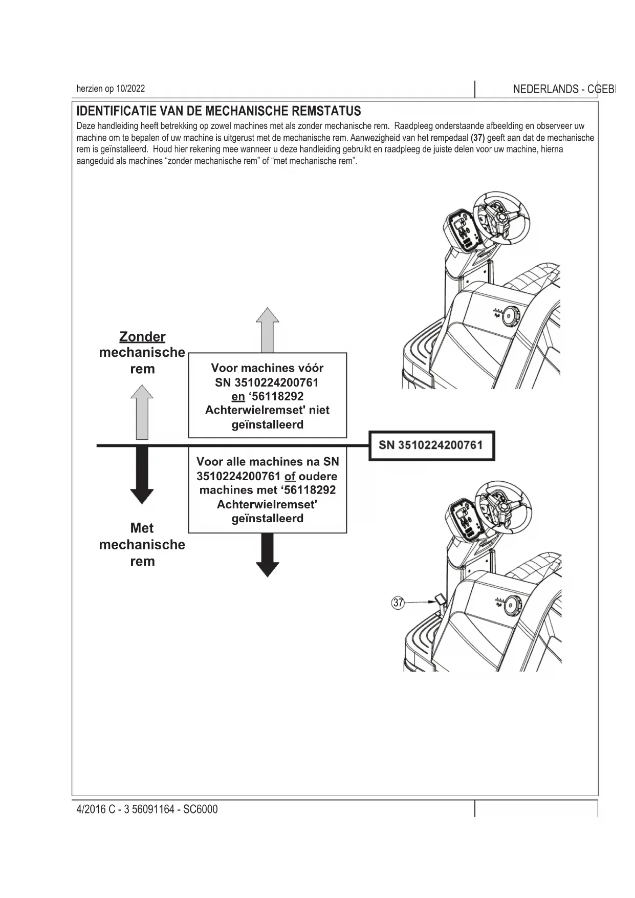 herzien op 10/2022 Zonder mechanische rem Voor machines vóór SN 3510224200761 en ‘56118292 Achterwielremset' niet geïnstalleerd Met mechanische rem Voor alle machines na SN 3510224200761 of oudere machines met ‘56118292 Achterwielremset' geïnstalleerdC - 4 SC6000 - 56091164 4/2016