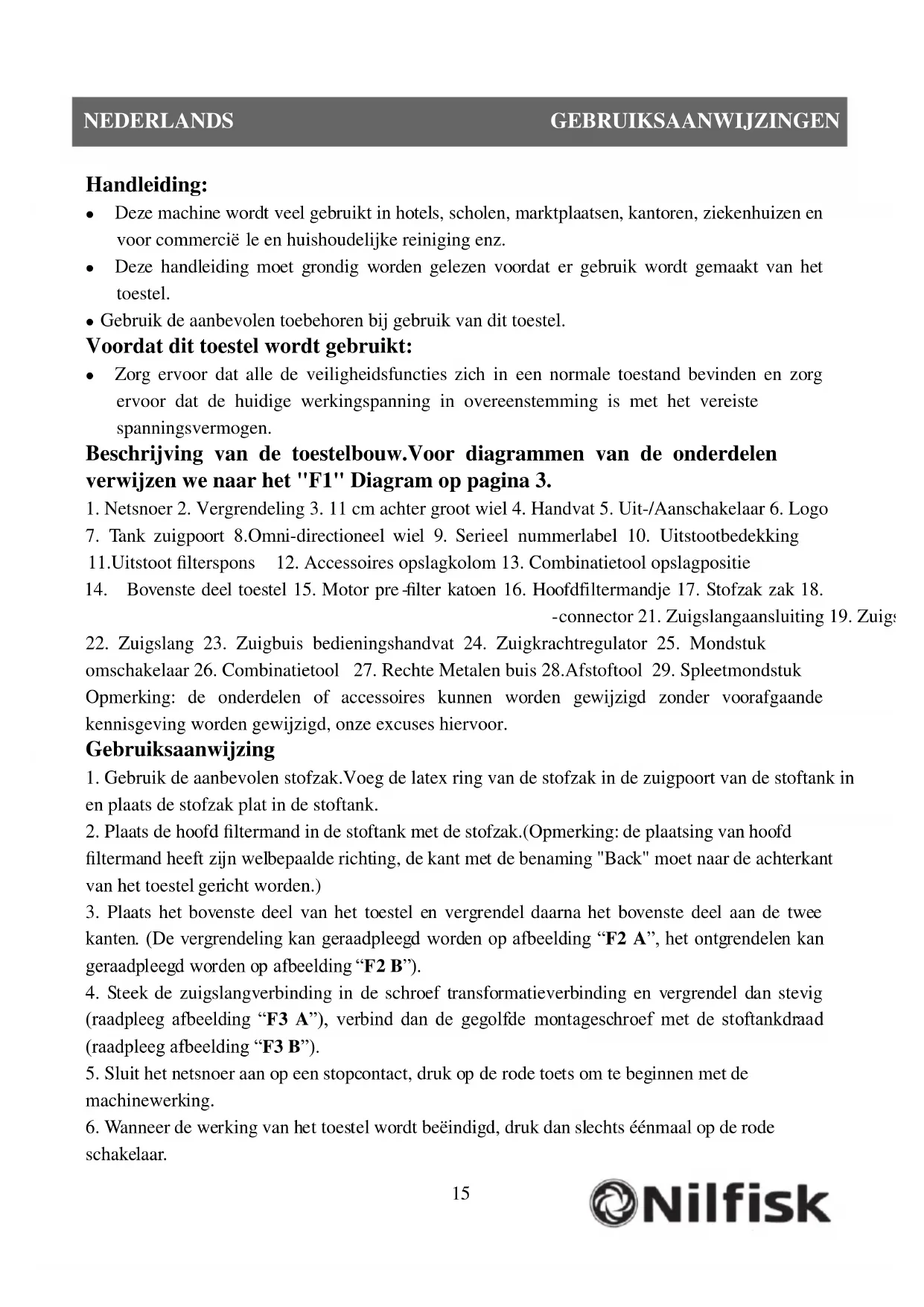 Handleiding: Deze machine wordt veel gebruikt in hotels, scholen, marktplaatsen, kantoren, ziekenhuizen en voor commerciële en huishoudelijke reiniging enz. Deze handleiding moet grondig worden gelezen voordat er gebruik wordt gemaakt van het toestel. Gebruik de aanbevolen toebehoren bij gebruik van dit toestel. Voordat dit toestel wordt gebruikt: Zorg ervoor dat alle de veiligheidsfuncties zich in een normale toestand bevinden en zorg ervoor dat de huidige werkingspanning in overeenstemming is met het vereiste spanningsvermogen. Beschrijving van de toestelbouw.Voor diagrammen van de onderdelen verwijzen we naar het "F1" Diagram op pagina 3.