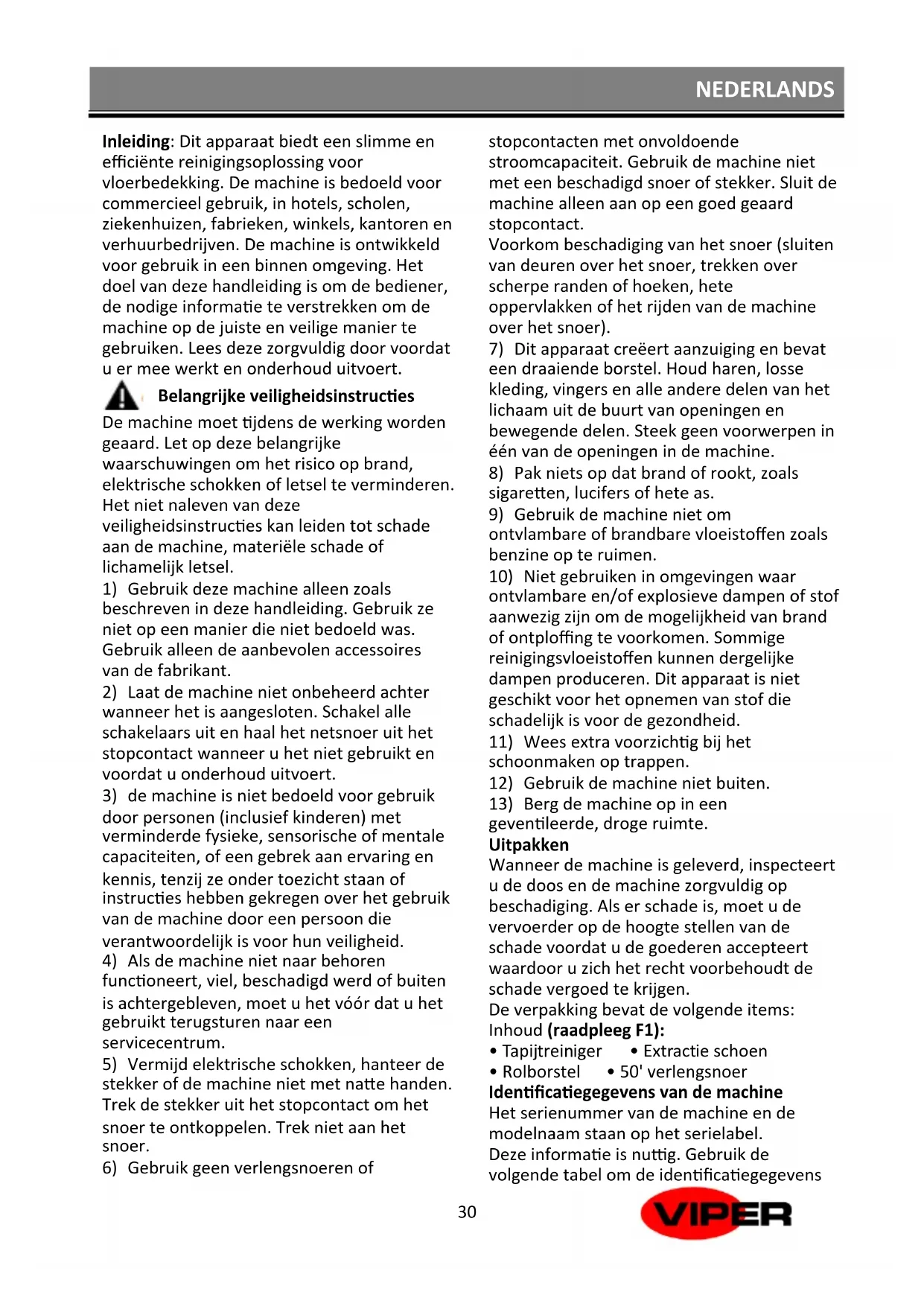 Inleiding: Dit apparaat biedt een slimme en efficiënte reinigingsoplossing voor vloerbedekking. De machine is bedoeld voor commercieel gebruik, in hotels, scholen, ziekenhuizen, fabrieken, winkels, kantoren en verhuurbedrijven. De machine is ontwikkeld voor gebruik in een binnen omgeving. Het doel van deze handleiding is om de bediener, de nodige informatie te verstrekken om de machine op de juiste en veilige manier te gebruiken. Lees deze zorgvuldig door voordat u er mee werkt en onderhoud uitvoert.