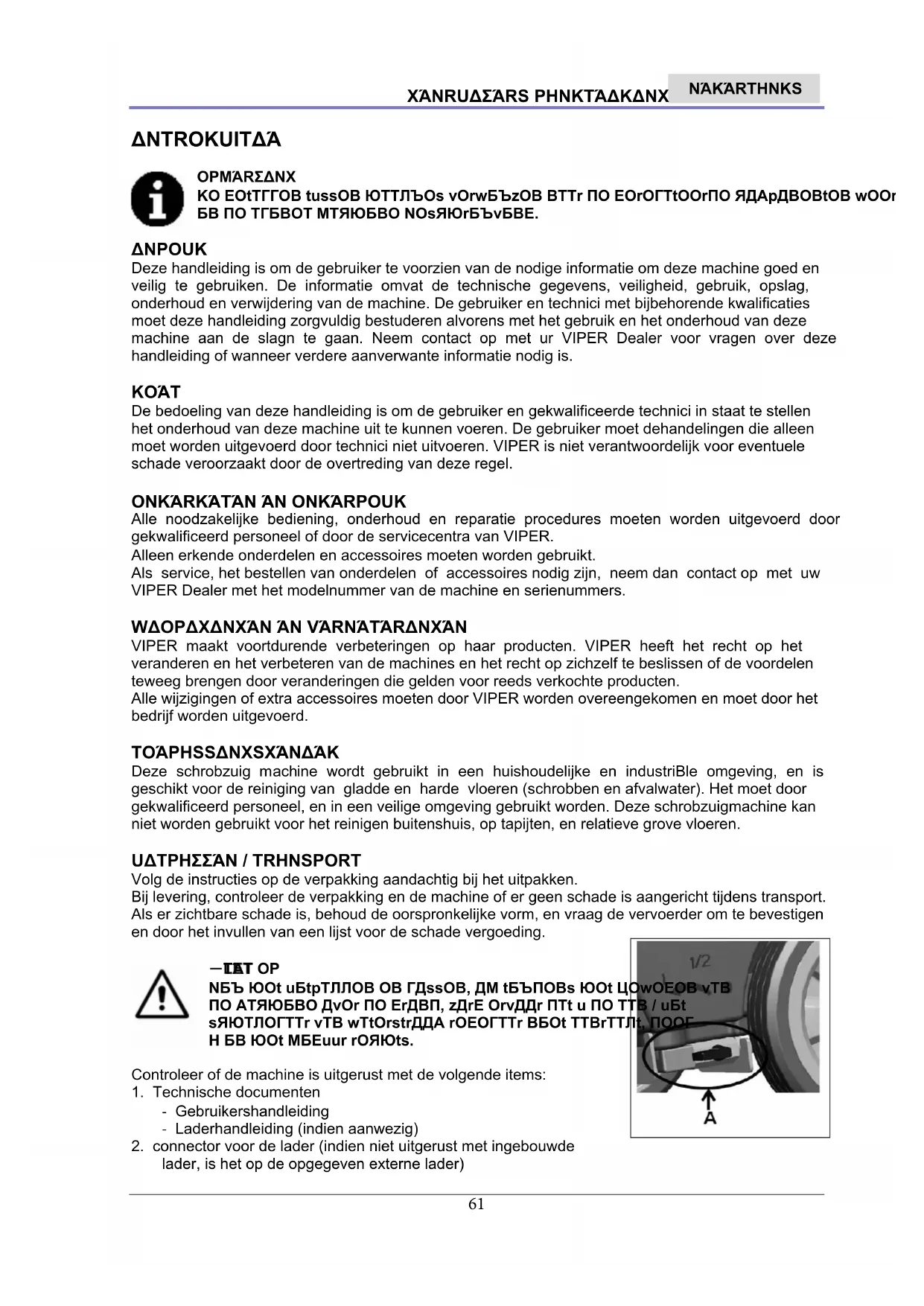 VIPER maakt voortdurende verbeteringen op haar producten. VIPER heeft het recht op het veranderen en het verbeteren van de machines en het recht op zichzelf te beslissen of de voordelen teweeg brengen door veranderingen die gelden voor reeds verkochte producten. Alle wijzigingen of extra accessoires moeten door VIPER worden overeengekomen en moet door het bedrijf worden uitgevoerd. TOEPASSINGSGEBIED Deze schrobzuig machine wordt gebruikt in een huishoudelijke en industriële omgeving, en is geschikt voor de reiniging van gladde en harde vloeren (schrobben en afvalwater). Het moet door gekwalificeerd personeel, en in een veilige omgeving gebruikt worden. Deze schrobzuigmachine kan niet worden gebruikt voor het reinigen buitenshuis, op tapijten, en relatieve grove vloeren. UITPAKKEN / TRANSPORT Volg de instructies op de verpakking aandachtig bij het uitpakken. Bij levering, controleer de verpakking en de machine of er geen schade is aangericht tijdens transport. Als er zichtbare schade is, behoud de oorspronkelijke vorm, en vraag de vervoerder om te bevestigen en door het invullen van een lijst voor de schade vergoeding.