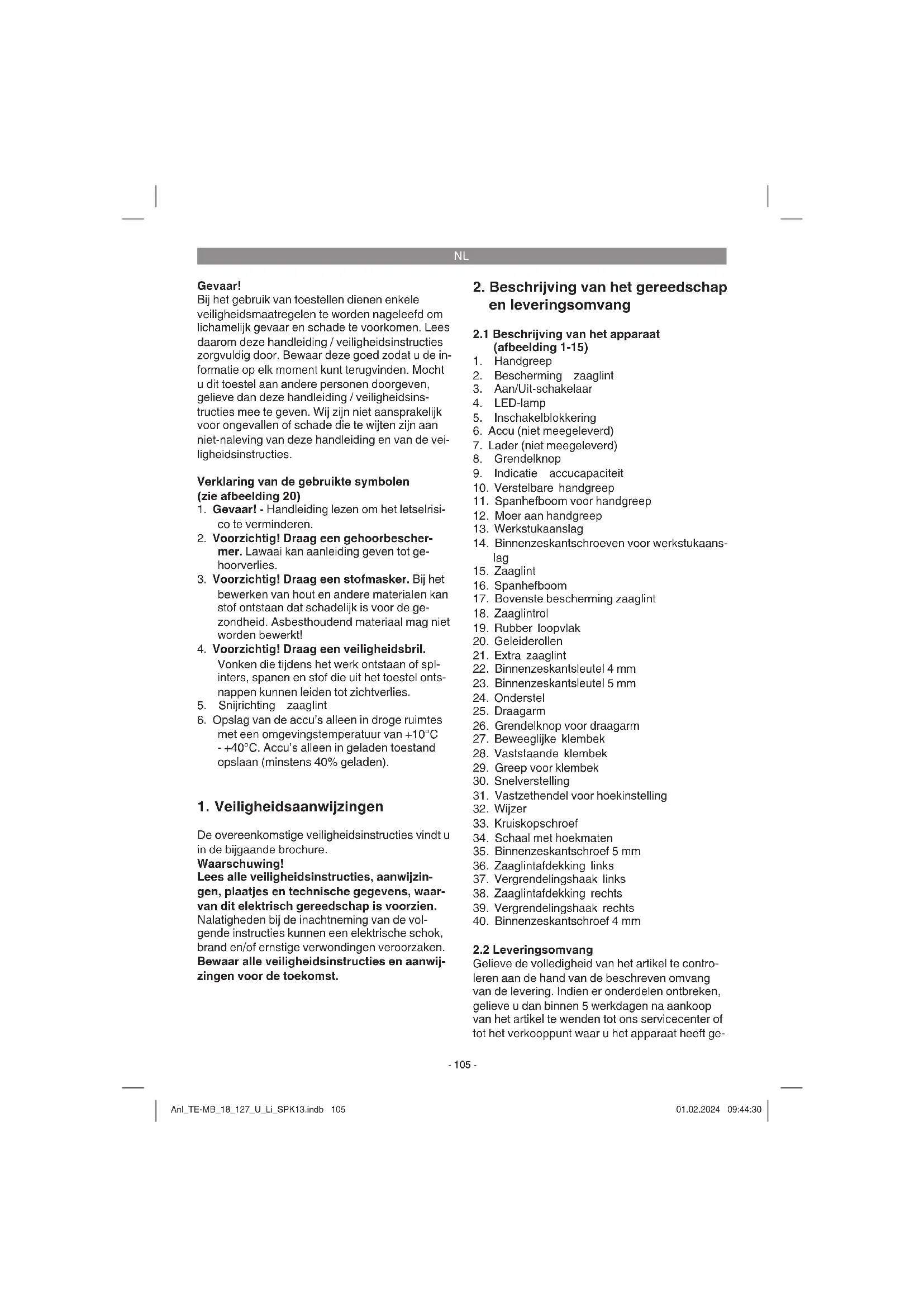 Gelieve de volledigheid van het artikel te contro- leren aan de hand van de beschreven omvang van de levering. Indien er onderdelen ontbreken, gelieve u dan binnen 5 werkdagen na aankoop van het artikel te wenden tot ons servicecenter of tot het verkooppunt waar u het apparaat heeft ge- Anl_TE-MB_18_127_U_Li_SPK13.indb 105Anl_TE-MB_18_127_U_Li_SPK13.indb 105 01.02.2024 09:44:3001.02.2024 09:44:30NL