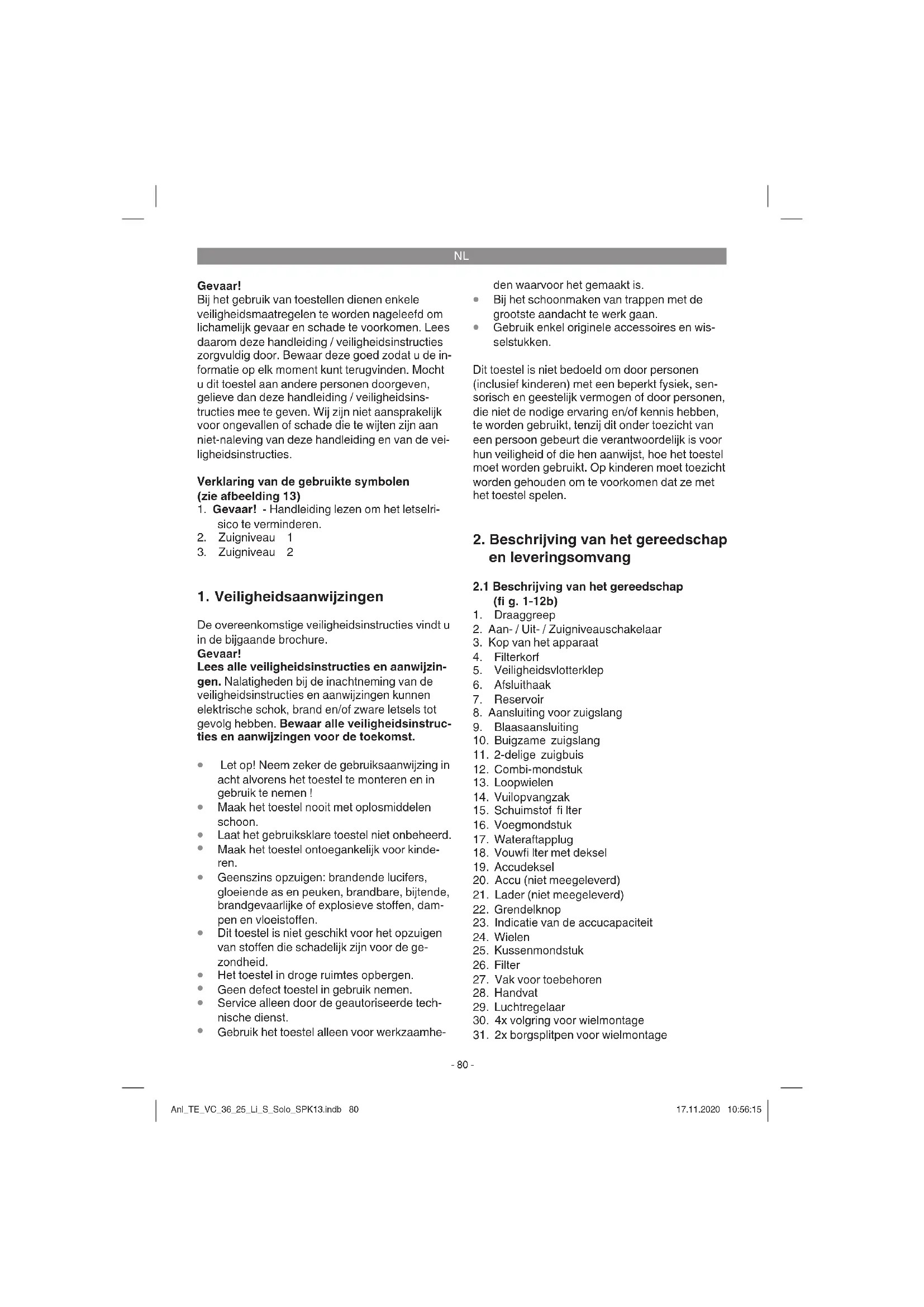 en de accupack naar onze klantenservice. Voor een deskundige verzending verzoeken wij u contact op te nemen met onze klan- tendienst of het verkooppunt waar u het ap- paraat heeft aangekocht. Zorg er bij de verzending of verwerking van accu’s resp. het accu apparaat voor dat deze afzonderlijk worden verpakt in plastic zakken, om kortsluitingen en brand te vermijden! In het belang van een lange levensduur van de accupack is het raadzaam om op tijd voor het herladen van de accupack te zorgen. Dit is in elk geval noodzakelijk, wanneer u vaststelt dat het vermogen van het apparaat afneemt. Ontlaad de Anl_TE_VC_36_25_Li_S_Solo_SPK13.indb 82Anl_TE_VC_36_25_Li_S_Solo_SPK13.indb 82 17.11.2020 10:56:1617.11.2020 10:56:16NL