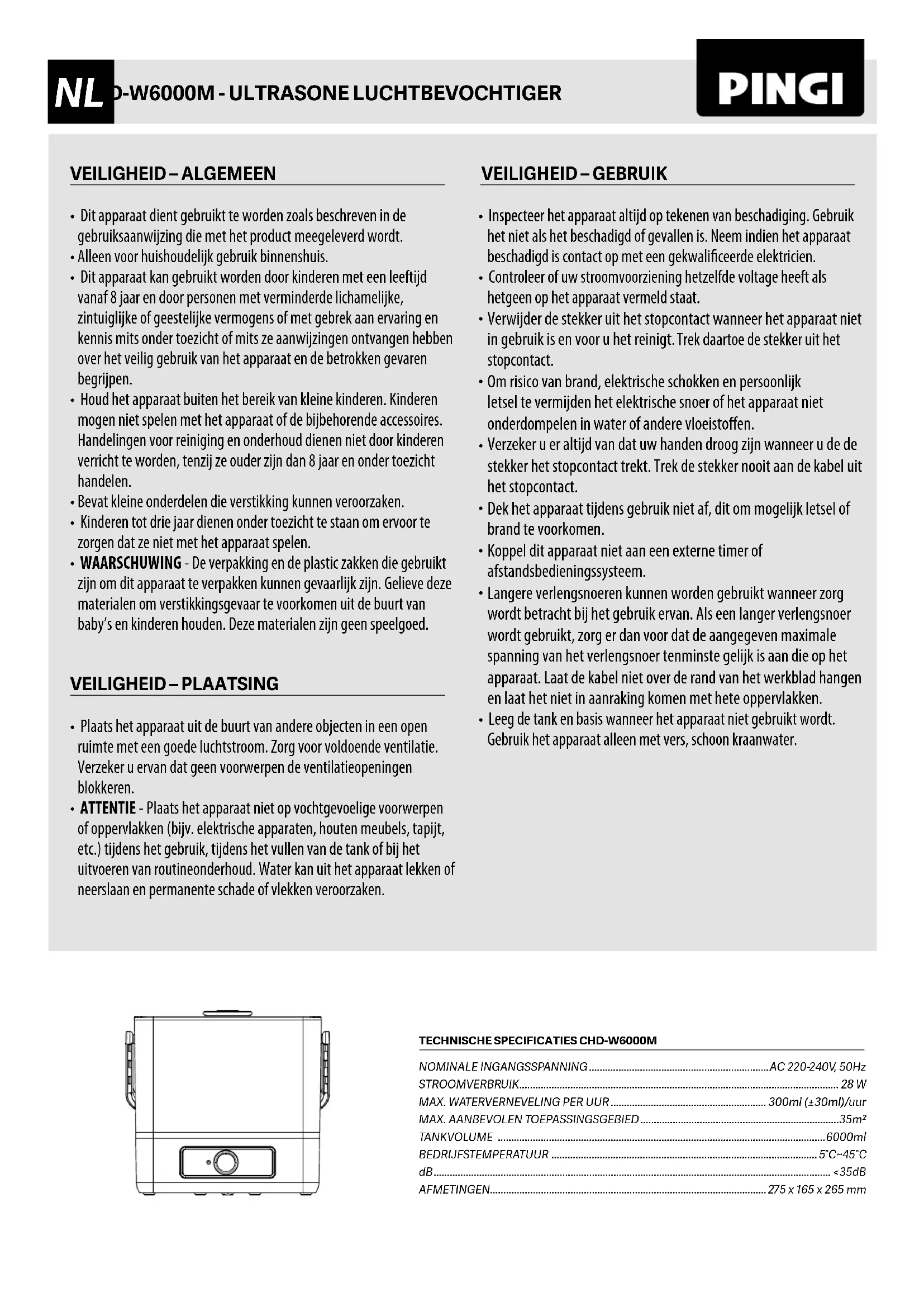 NLBEOOGD GEBRUIK Uw nieuwe Pingi Cascada luchtbevochtiger (CHD-W6000M) is geschikt voor het bevochtigen van de lucht in afgesloten binnenruimtes. Het apparaat werkt op 220-240V, 50Hz (netstroom). Sluit het apparaat nooit op een andere spanningsbron aan. Volg de aanwijzingen in deze handleiding nauwkeurig op en lees de handleiding zorgvuldig door. Bewaar deze instructies op een veilige plaats zodat ze altijd beschikbaar zijn. Dit apparaat voldoet aan de wettelijke nationale en Europese regelgeving. Probeer het apparaat nooit zelf technisch aan te passen. Wij aanvaarden geen aansprakelijkheid voor ongevallen of schades die ontstaan door het niet navolgen van deze gebruikshandleiding.