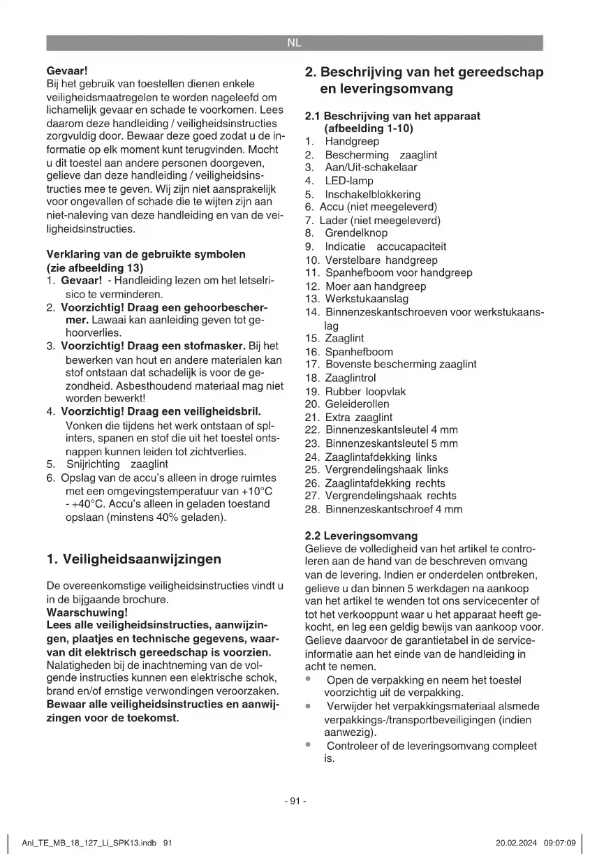 Bewaar het toestel en de accessoires op een don- kere, droge en vorstvrije plaats die voor kinderen ontoegankelijk is. De optimale opbergtemperatuur ligt tussen 5° C en 30° C. Bewaar het elektrische gereedschap in de originele verpakking. Aanwijzing! Om het zaaglint in een goede staat te houden raden wij u aan om het lint als de ma- chine langer niet wordt gebruikt te ontspannen (zie 5.5). Bovendien bevelen wij bij langere opslag aan om de geleiderollen (20) te beschermen met minerale olie. Anl_TE_MB_18_127_Li_SPK13.indb 97Anl_TE_MB_18_127_Li_SPK13.indb 97 20.02.2024 09:07:1120.02.2024 09:07:11NL
