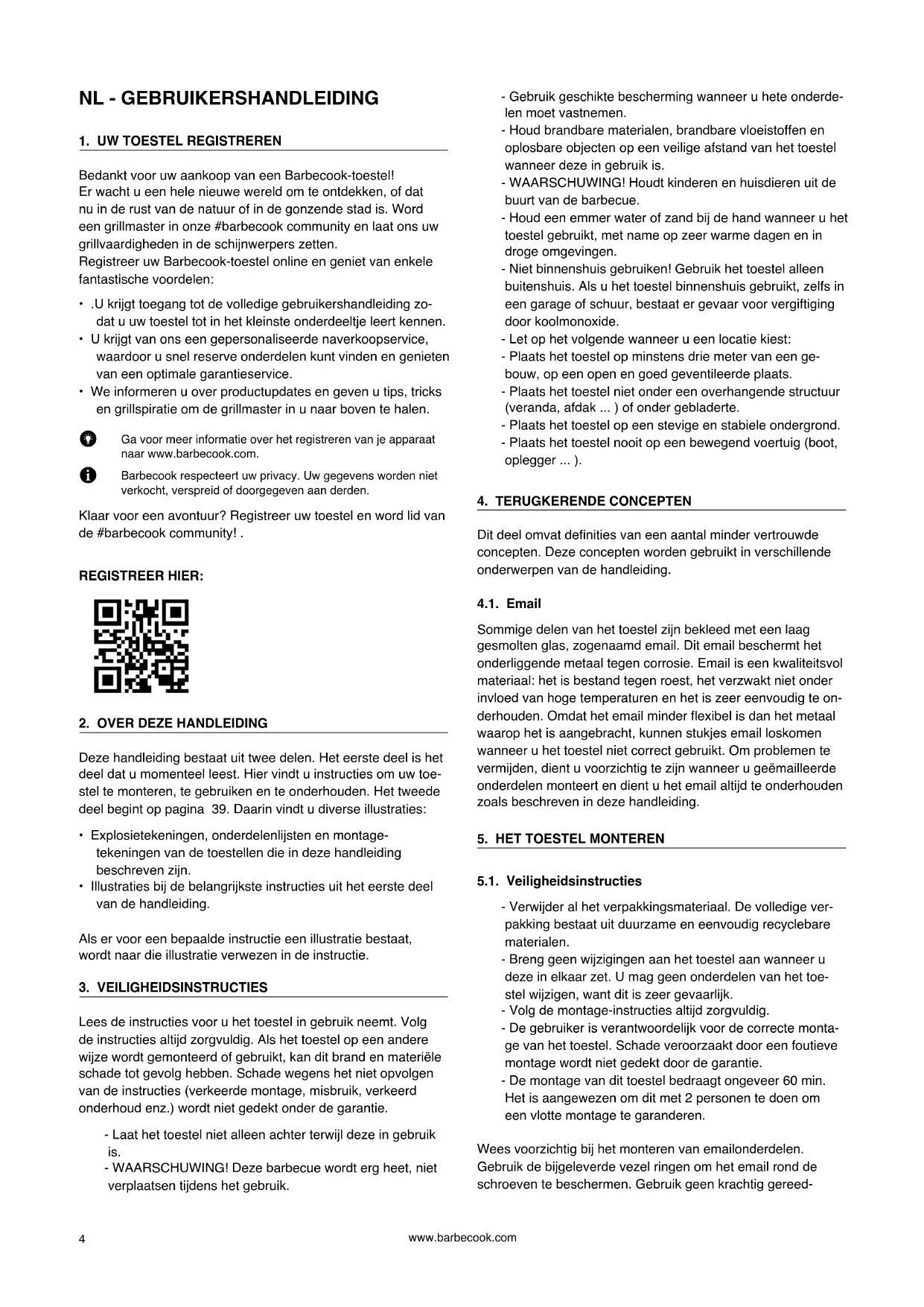 5.1. Veiligheidsinstructies - Verwijder al het verpakkingsmateriaal. De volledige ver- pakking bestaat uit duurzame en eenvoudig recyclebare materialen. - Breng geen wijzigingen aan het toestel aan wanneer u deze in elkaar zet. U mag geen onderdelen van het toe- stel wijzigen, want dit is zeer gevaarlijk. - Volg de montage-instructies altijd zorgvuldig. - De gebruiker is verantwoordelijk voor de correcte monta- ge van het toestel. Schade veroorzaakt door een foutieve montage wordt niet gedekt door de garantie. - De montage van dit toestel bedraagt ongeveer 60 min. Het is aangewezen om dit met 2 personen te doen om een vlotte montage te garanderen. Wees voorzichtig bij het monteren van emailonderdelen. Gebruik de bijgeleverde vezel ringen om het email rond de schroeven te beschermen. Gebruik geen krachtig gereed-www.barbecook.com