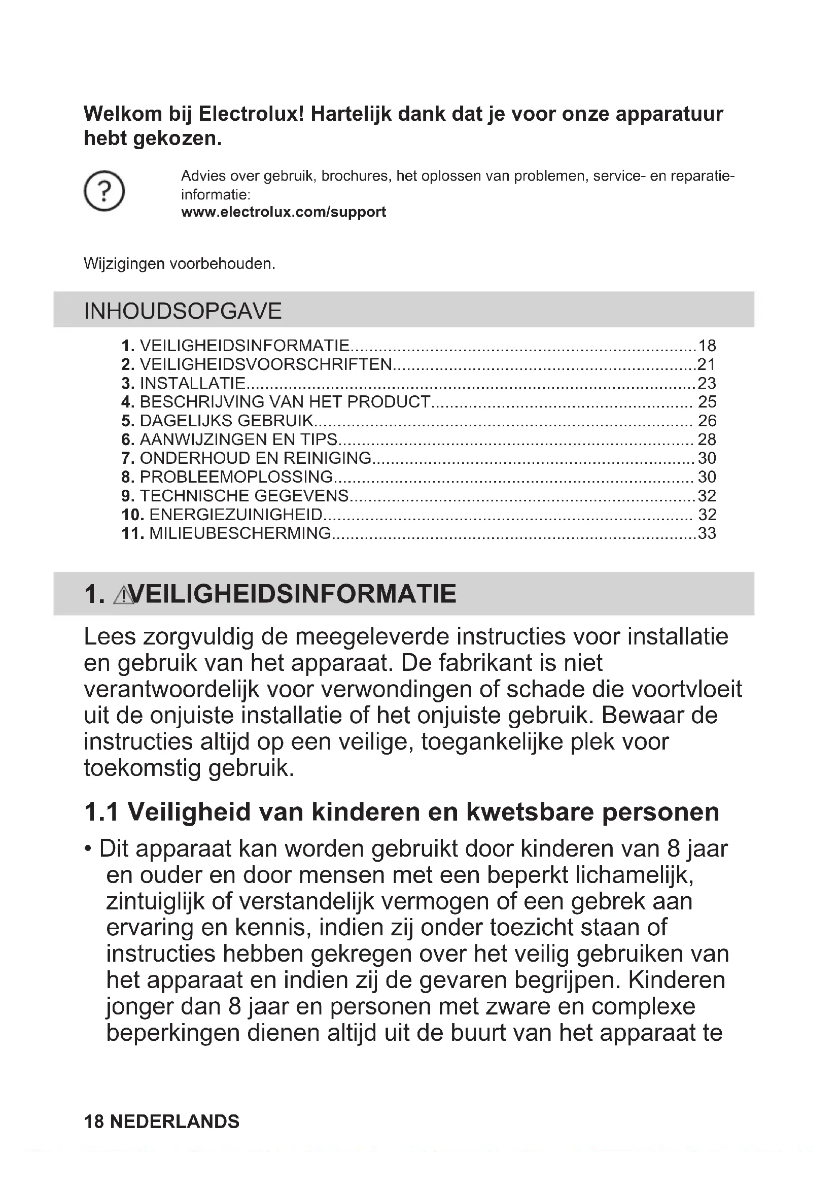 Recycleer de materialen met het symbool . Gooi de verpakking in een geschikte afvalcontainer om het te recycleren. Bescherm het milieu en de volksgezondheid en recycleer op een correcte manier het afval van elektrische en elektronische apparaten. Gooi apparaten gemarkeerd met het symbool niet weg met het huishoudelijk afval. Breng het product naar het milieustation bij u in de buurt of neem contact op met de gemeente. NEDERLANDS 33Welcome to Electrolux! Thank you for choosing our appliance. Get usage advice, brochures, trouble shooter, service and repair information:www.electrolux.com/supportSubject to change without notice. CONTENTS