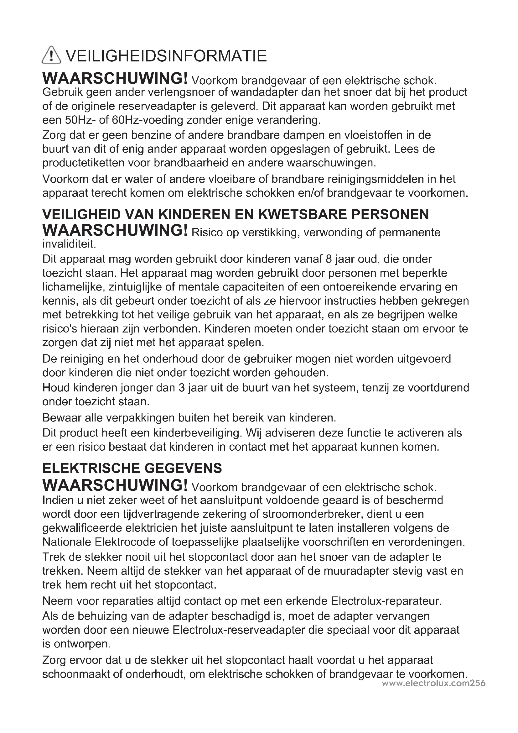 WAARSCHUWING! Risico op verstikking, verwonding of permanente invaliditeit. Dit apparaat mag worden gebruikt door kinderen vanaf 8 jaar oud, die onder toezicht staan. Het apparaat mag worden gebruikt door personen met beperkte lichamelijke, zintuiglijke of mentale capaciteiten of een ontoereikende ervaring en kennis, als dit gebeurt onder toezicht of als ze hiervoor instructies hebben gekregen met betrekking tot het veilige gebruik van het apparaat, en als ze begrijpen welke risico's hieraan zijn verbonden. Kinderen moeten onder toezicht staan om ervoor te zorgen dat zij niet met het apparaat spelen. De reiniging en het onderhoud door de gebruiker mogen niet worden uitgevoerd door kinderen die niet onder toezicht worden gehouden. Houd kinderen jonger dan 3 jaar uit de buurt van het systeem, tenzij ze voortdurend onder toezicht staan. Bewaar alle verpakkingen buiten het bereik van kinderen. Dit product heeft een kinderbeveiliging. Wij adviseren deze functie te activeren als er een risico bestaat dat kinderen in contact met het apparaat kunnen komen. ELEKTRISCHE GEGEVENS WAARSCHUWING! Voorkom brandgevaar of een elektrische schok. Indien u niet zeker weet of het aansluitpunt voldoende geaard is of beschermd wordt door een tijdvertragende zekering of stroomonderbreker, dient u een gekwaliceerde elektricien het juiste aansluitpunt te laten installeren volgens de Nationale Elektrocode of toepasselijke plaatselijke voorschriften en verordeningen. Trek de stekker nooit uit het stopcontact door aan het snoer van de adapter te trekken. Neem altijd de stekker van het apparaat of de muuradapter stevig vast en trek hem recht uit het stopcontact. Neem voor reparaties altijd contact op met een erkende Electrolux-reparateur. Als de behuizing van de adapter beschadigd is, moet de adapter vervangen worden door een nieuwe Electrolux-reserveadapter die speciaal voor dit apparaat is ontworpen. Zorg ervoor dat u de stekker uit het stopcontact haalt voordat u het apparaat schoonmaakt of onderhoudt, om elektrische schokken of brandgevaar te voorkomen.www.electrolux.com 257 VEILIGHEIDSVOORSCHRIFTEN OPGELET! Vermijd ernstig of dodelijk letsel. Steek of breng geen vingers of voorwerpen in het luchtuitlaatrooster van het apparaat. Stop in geval van een storing (vonken, brandlucht, enz.) onmiddellijk het gebruik, trek het netsnoer uit het stopcontact en bel een erkende Electrolux- servicetechnicus. Bedien het apparaat nooit met natte handen. OPGELET! Voorkom letsel of schade aan het apparaat of eigendom. Richt de luchtstroom niet rechtstreeks op open haarden of andere warmtebronnen, aangezien dit tot opvlammingen kan leiden. Klim niet op het apparaat en plaats er geen voorwerpen op. Hang geen voorwerpen aan het apparaat. Plaats geen containers met vloeistoen op het apparaat. Schakel het apparaat bij de spanningsbron UIT als het langere tijd niet wordt gebruikt. Gebruik het apparaat met geplaatst luchtlter. Blokkeer of bekleed niet het luchtinlaat- of het luchtuitlaatrooster. Zorg ervoor dat eventuele elektrische/elektronische apparatuur altijd op 30 cm afstand staat van het apparaat. Het apparaat mag uitsluitend met de door de fabrikant en diens servicemedewerker geleverde accessoires worden gebruikt. VERWIJDERING Het teken op het product of op de verpakking ervan geeft aan dat het product niet als huishoudelijk afval verwerkt mag worden. Neem het product mee naar een ocieel inzamelpunt of naar een Electrolux-servicecentrum dat de elektrische onderdelen op een veilige en professionele wijze kan verwijderen en recyclen. Neem de voorschriften van uw land voor de gescheiden inzameling van elektrische producten in acht. Dit product is ontworpen om het milieu te sparen. Alle plastic onderdelen zijn gemarkeerd voor recyclingdoeleinden.