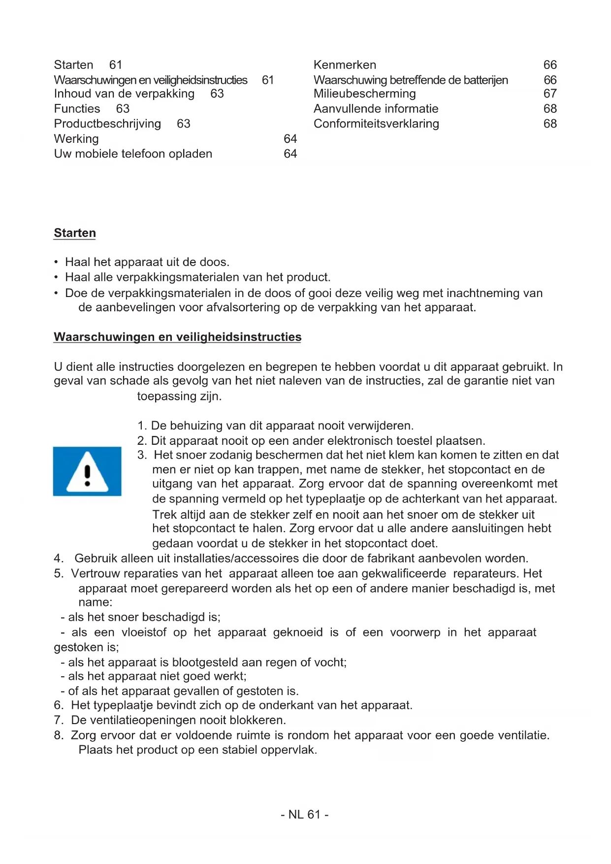 Plaats het product op een abiel oppervlak. Starten 61 Waarschuwingenenveiligheidsinstructies 61 Inhoudvandeverpakking 63 Functies 63 Productbeschrijving 63 Werking 64 Uwmobieletelefoonopladen 64 Kenmerken 66 Waarschuwingbetreendedebatterijen 66 Milieubescherming 67 Aanvullendeinformatie 68 Conformiteitsverklaring 68- NL 62 -