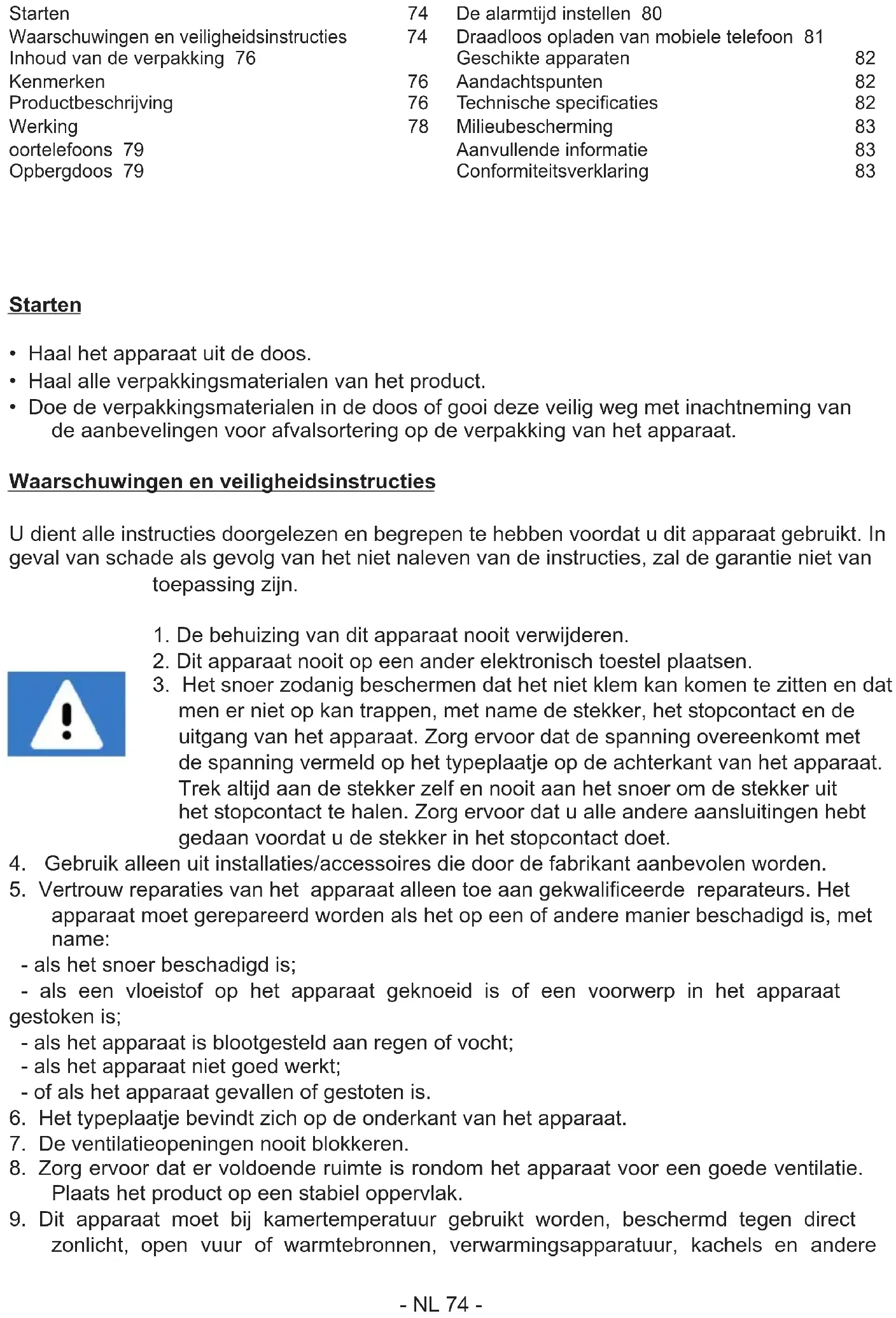 Inhoud van de verpakking 76 Kenmerken 76 Productbeschrijving 76 Werking 78 oortelefoons 79 Opbergdoos 79 De alarmtijd instellen 80 Draadloos opladen van mobiele telefoon 81 Geschikte apparaten 82 Aandachtspunten 82 Technische specicaties 82 Milieubescherming 83 Aanvullende informatie 83 Conformiteitsverklaring 83- NL 75 - apparaten (met inbegrip van vererkers) die warmte produceren. Dit apparaat niet in de buurt van warmtebronnen plaatsen.