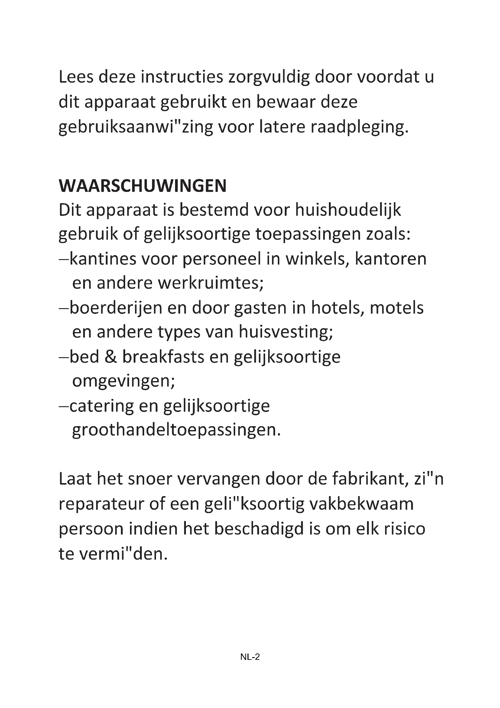 22WAARSCHUWINGEN Dit app araat is bestemd voor huishoudelijk gebruik of gelijksoortige toepassingen zoals: kantines voor personeel in winkels, kantoren en andere werkruimtes; boerderijen en door gasten in hotels, motels en andere types van huisvesting; bed & breakfasts en gelijksoortige omgevingen; catering en gelijksoortige groothandeltoepassingen.